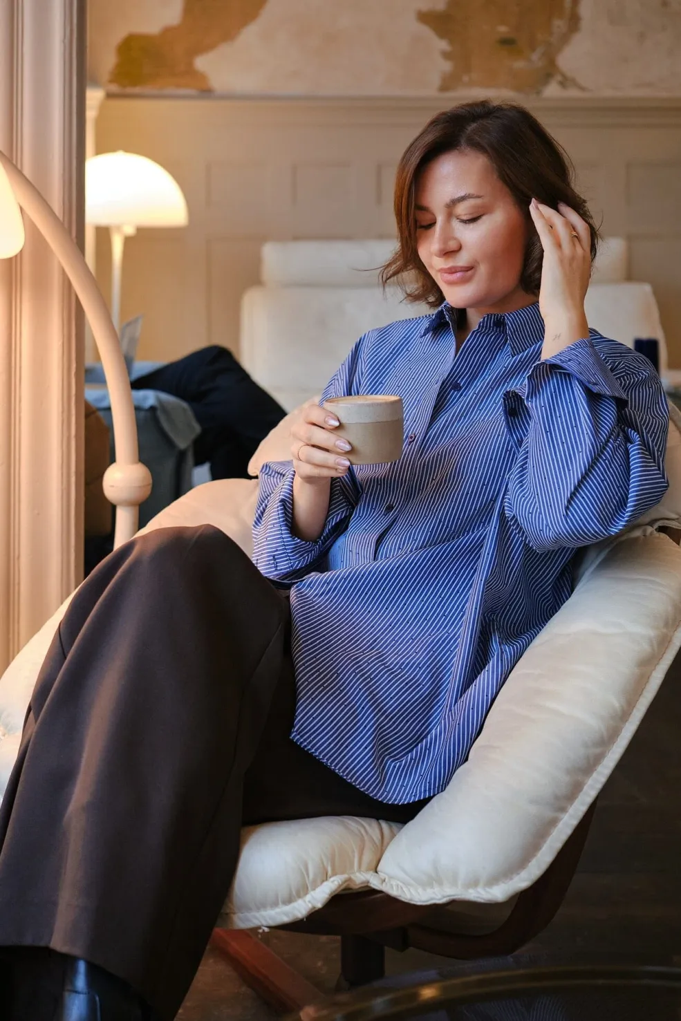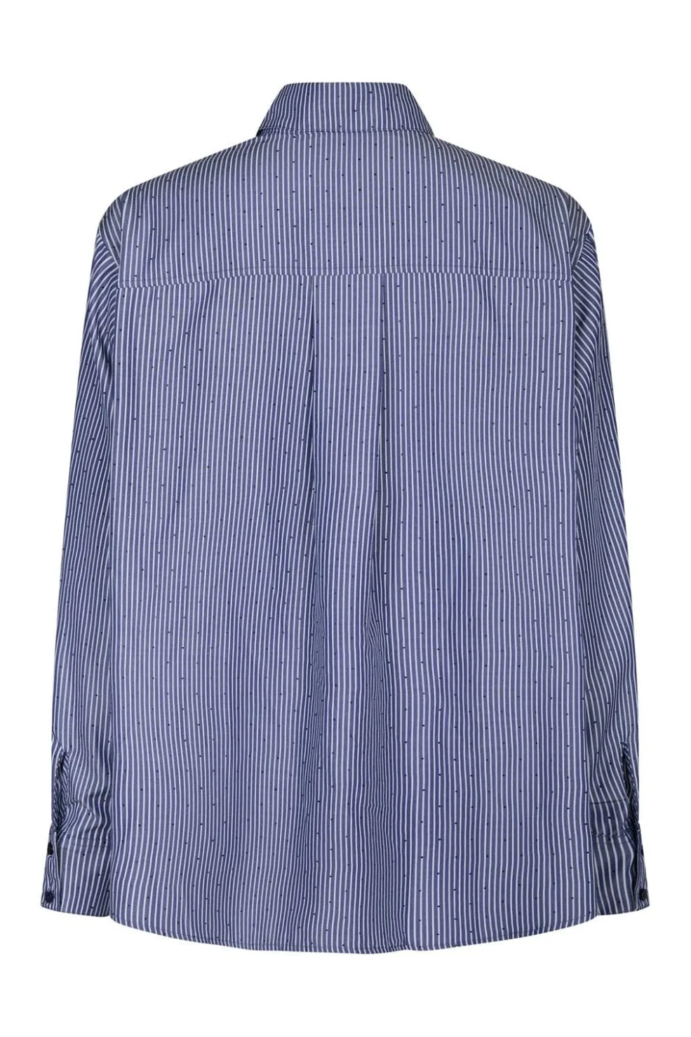 Mørkeblå skjorte fra Neo Noir med striber og glimmersten. Skjorten har en oversize pasform og kombinerer klassiske striber med små prikker og glimmerdetaljer.