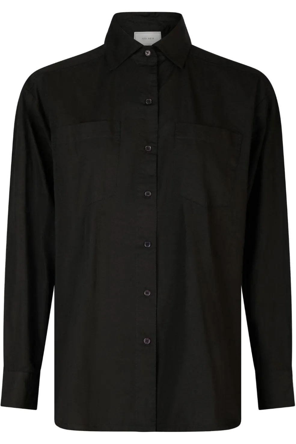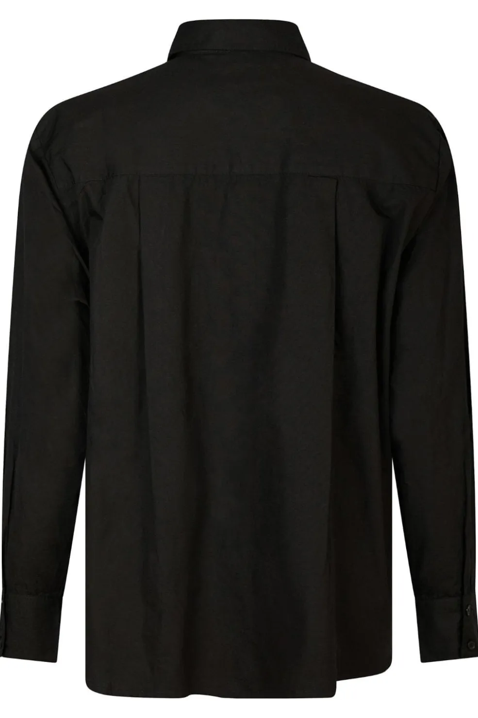 Sort poplin-skjorte fra Neo Noir med løs pasform. Den har klassisk skjortekrave, lange ærmer og to brystlommer. Skjorten kan styles med både bukser og nederdele.
