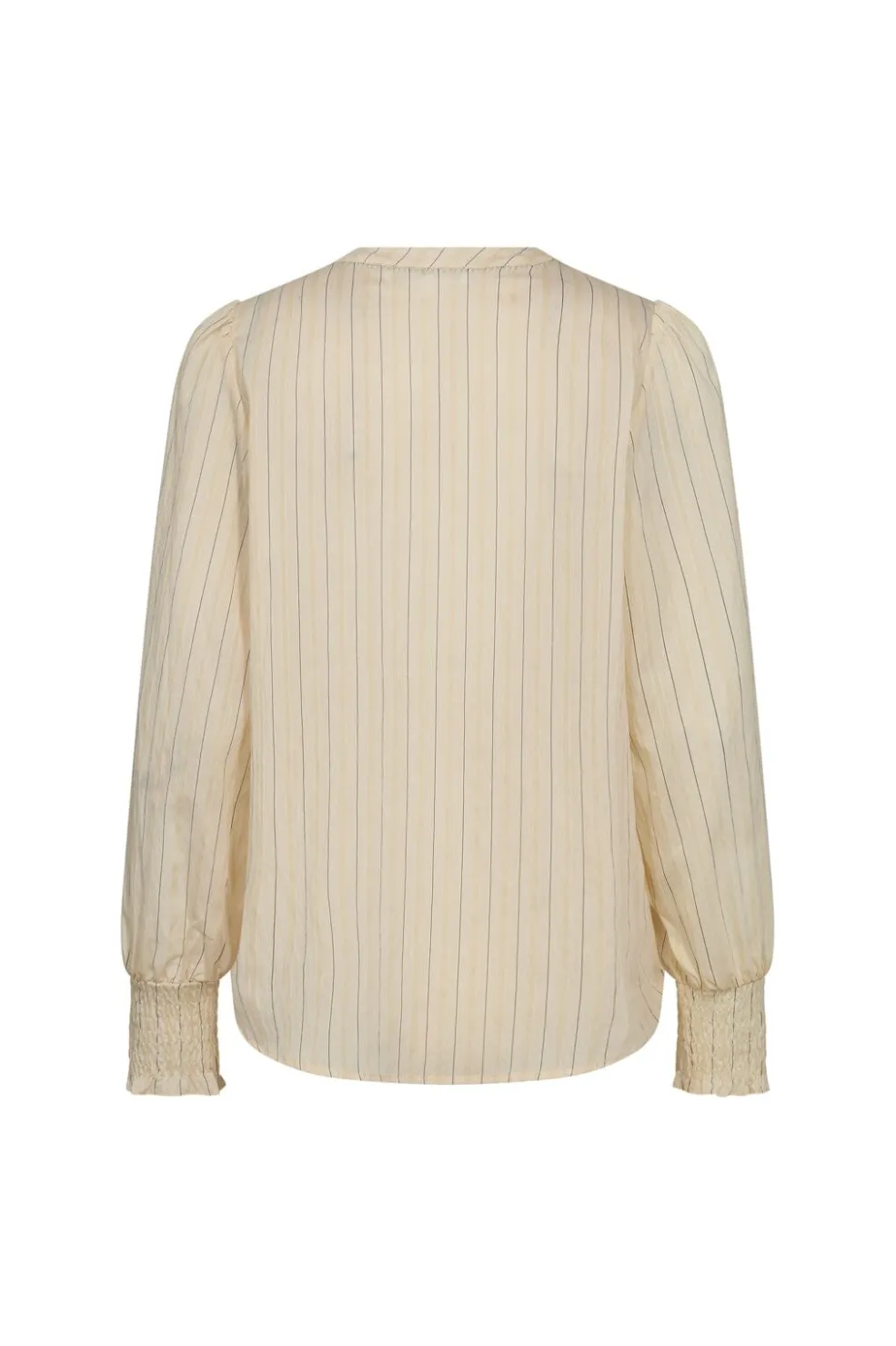 Lysegul bluse fra Co´Couture med stribemønster. Blusen har lange ærmer, rund hals og en løs pasform med flæsedetaljer ved halsen.
