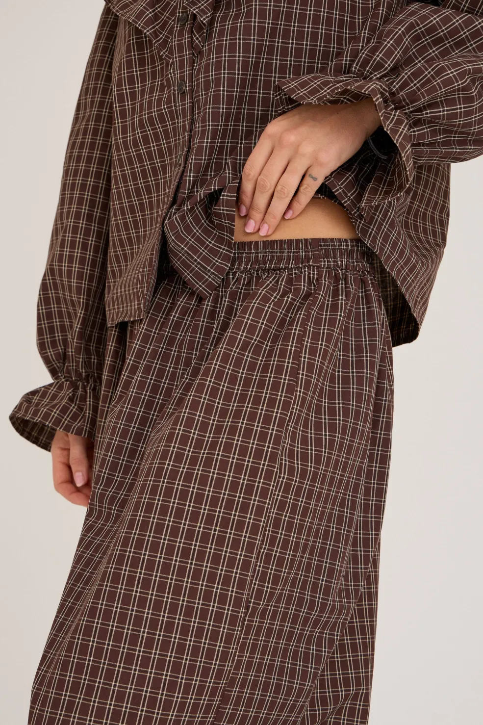 Ternede bukser fra A-View i brun og sand. Bukserne har en løs pasform og ankellængde med elastik og knapper i taljen.