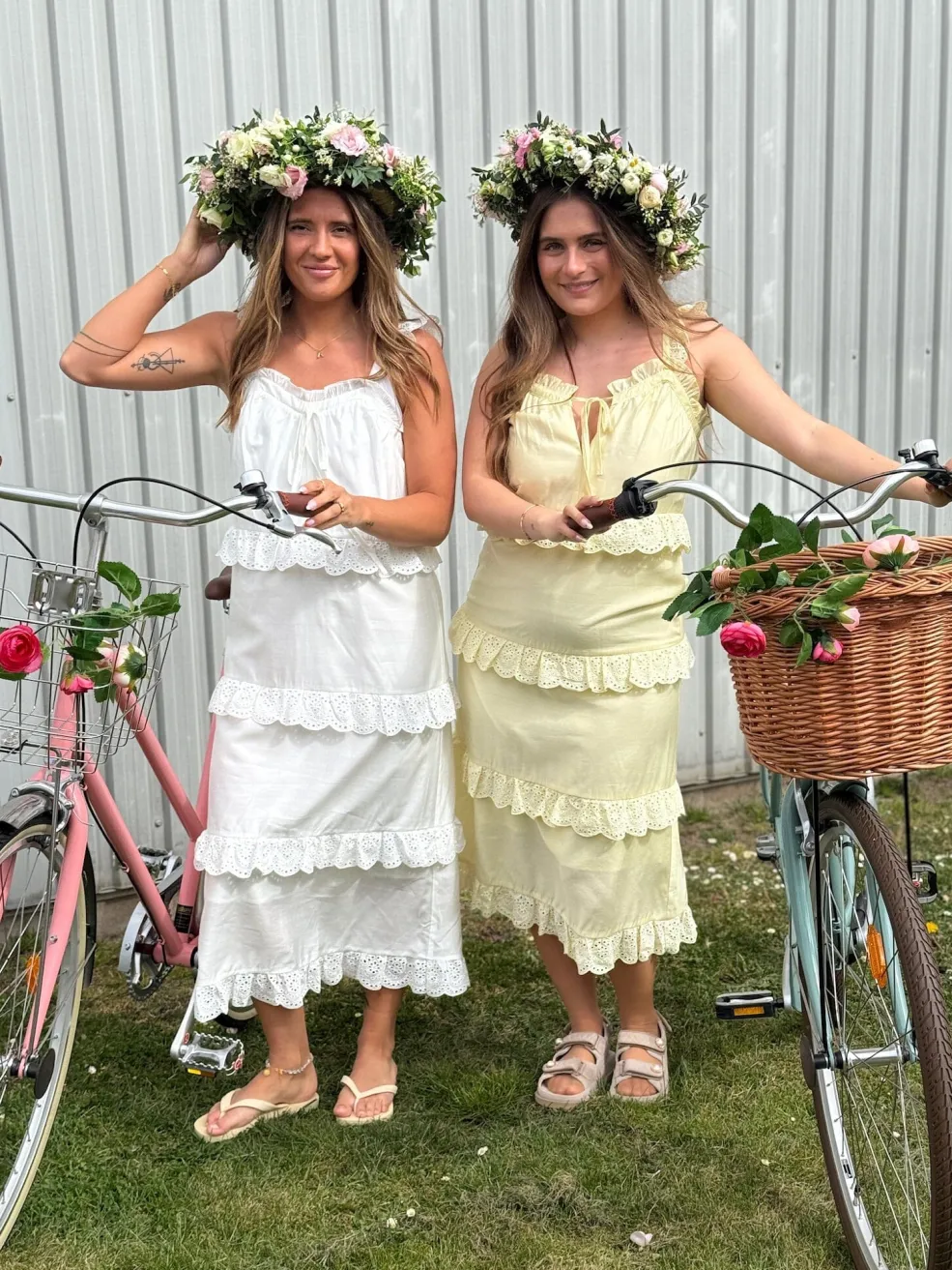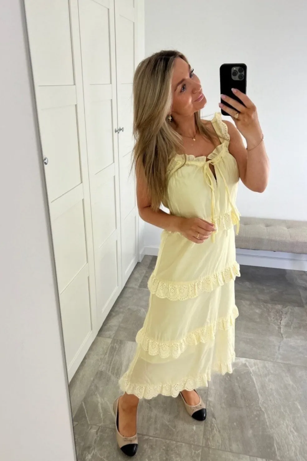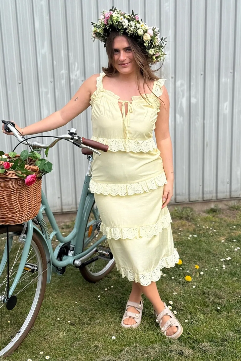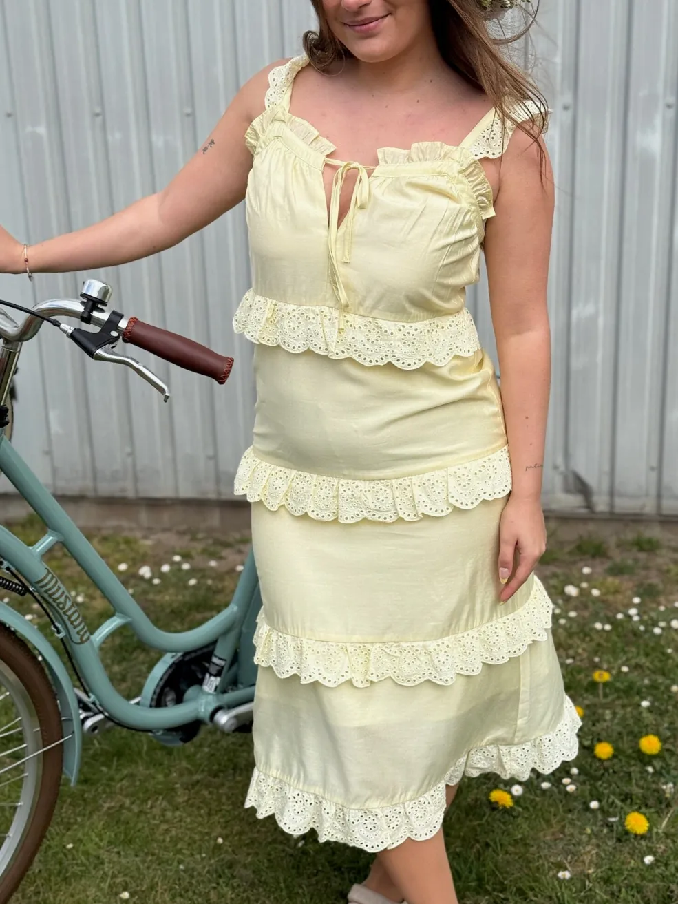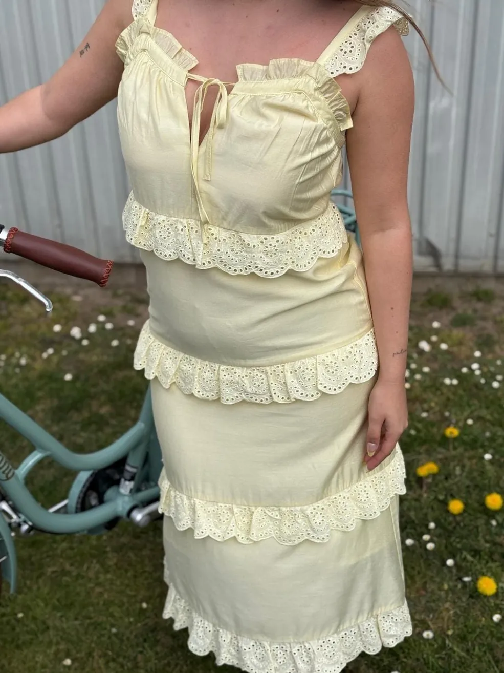 Gul kjole fra Dear Molly med lagdelt design. Kjolen har fine blondedetaljer på hvert lag og stropper med flæser. En snøredetalje foran giver mulighed for at justere pasformen.