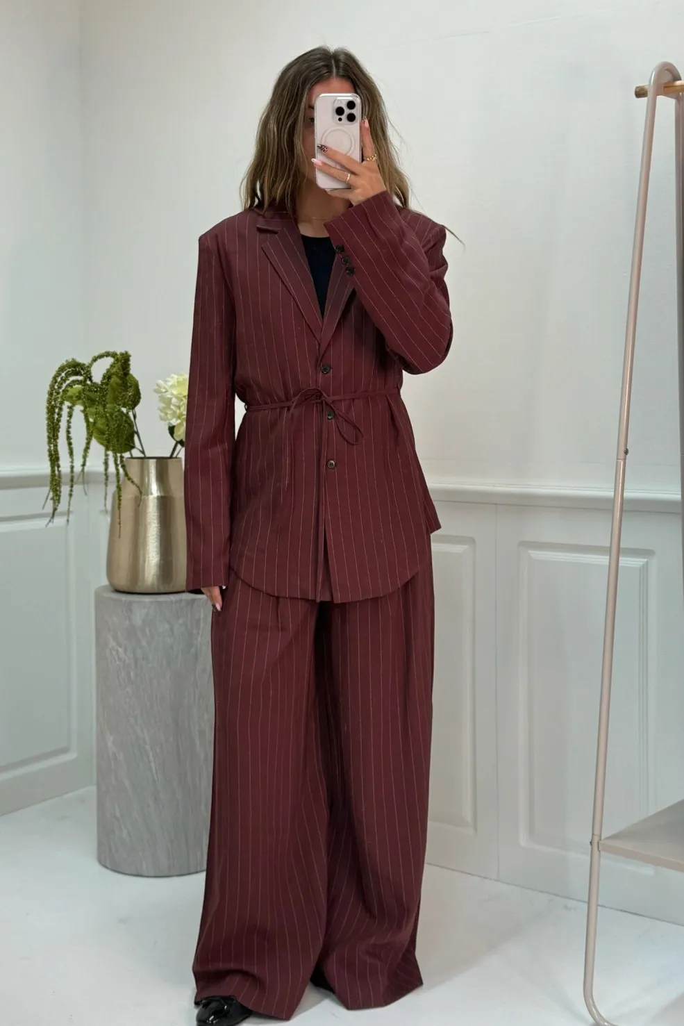 Vinrød blazer fra Dear Molly, lavet af vævet materiale med tynde lodrette striber. Blazeren har lange ærmer og en klassisk reverskrave.