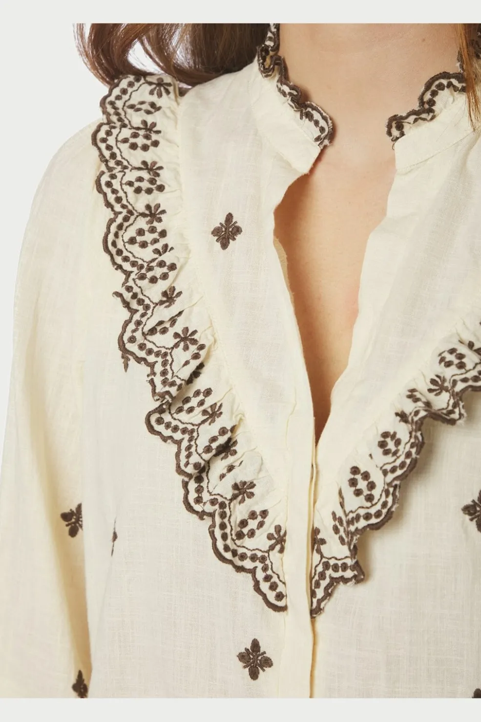 Bluse fra Neo Noir i lys gul bomuld med brune broderede blomster og blondebånd langs V-halsen og manchetterne.