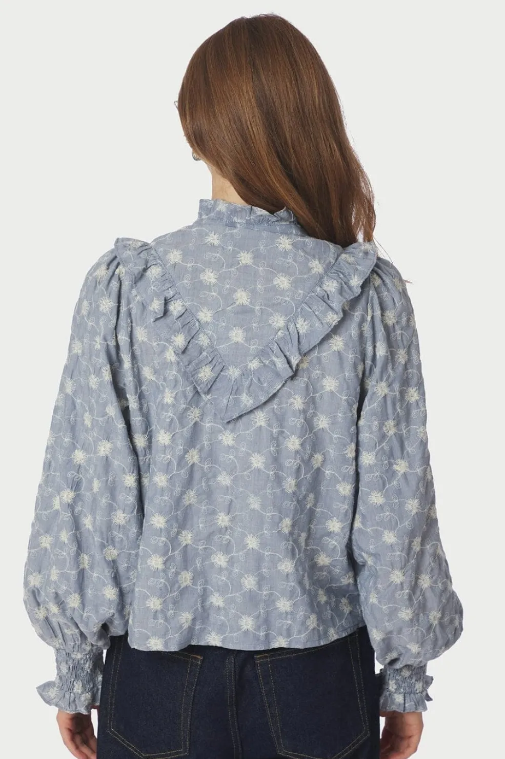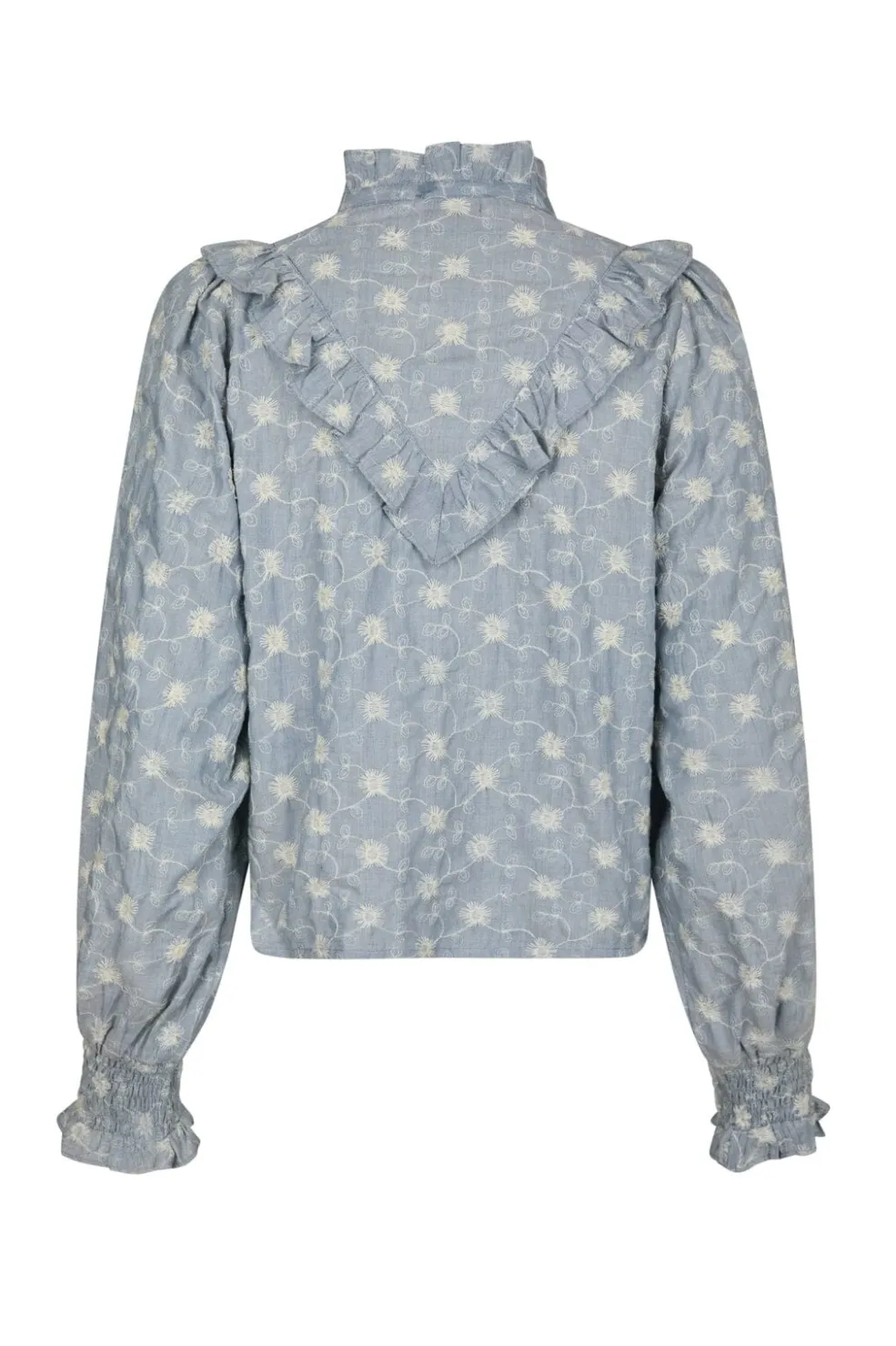 Støvet blå bluse fra Neo Noir, lavet af bomuld. Blusen har et blomstret mønster med broderi og flæsedetaljer langs halsudskæringen.