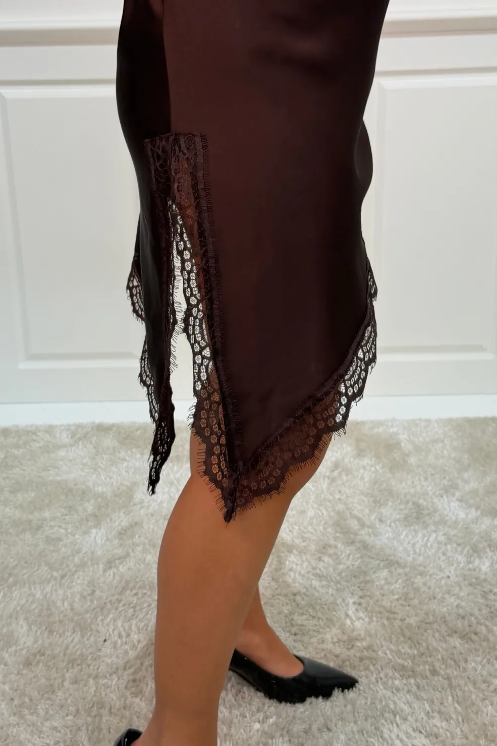 Knælang kjole fra A-bee i chokoladebrun viskose. Kjolen har tynde stropper, V-udskæring og blondedetaljer langs halsudskæringen og forneden.