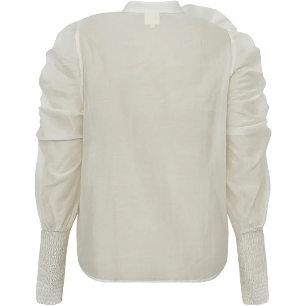 Cremefarvet bluse fra Gossia med store flæser på forsiden. Blusen har en skjortekrave, puffede lange ærmer og knaplukning foran.