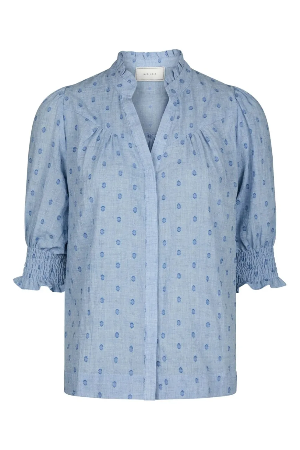 Lyseblå bluse fra Neo Noir i struktureret dobby-kvalitet. Blusen har et prikket mønster, V-hals med flæsedetaljer og 3/4-ærmer med shirring ved manchetterne.