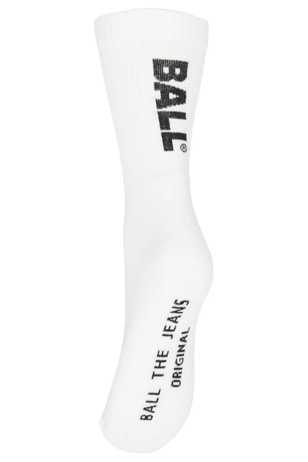 Hvide sokker fra Ball med sort tekst. Sokkerne har et distinkt design med BALL-logo og teksten THE JEANS, der gør dem til mere end bare basis-sokker.