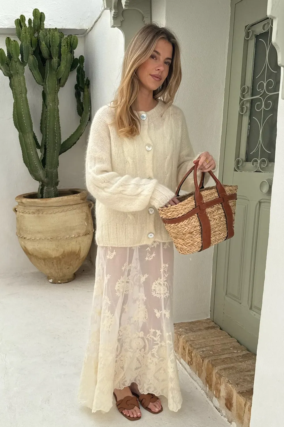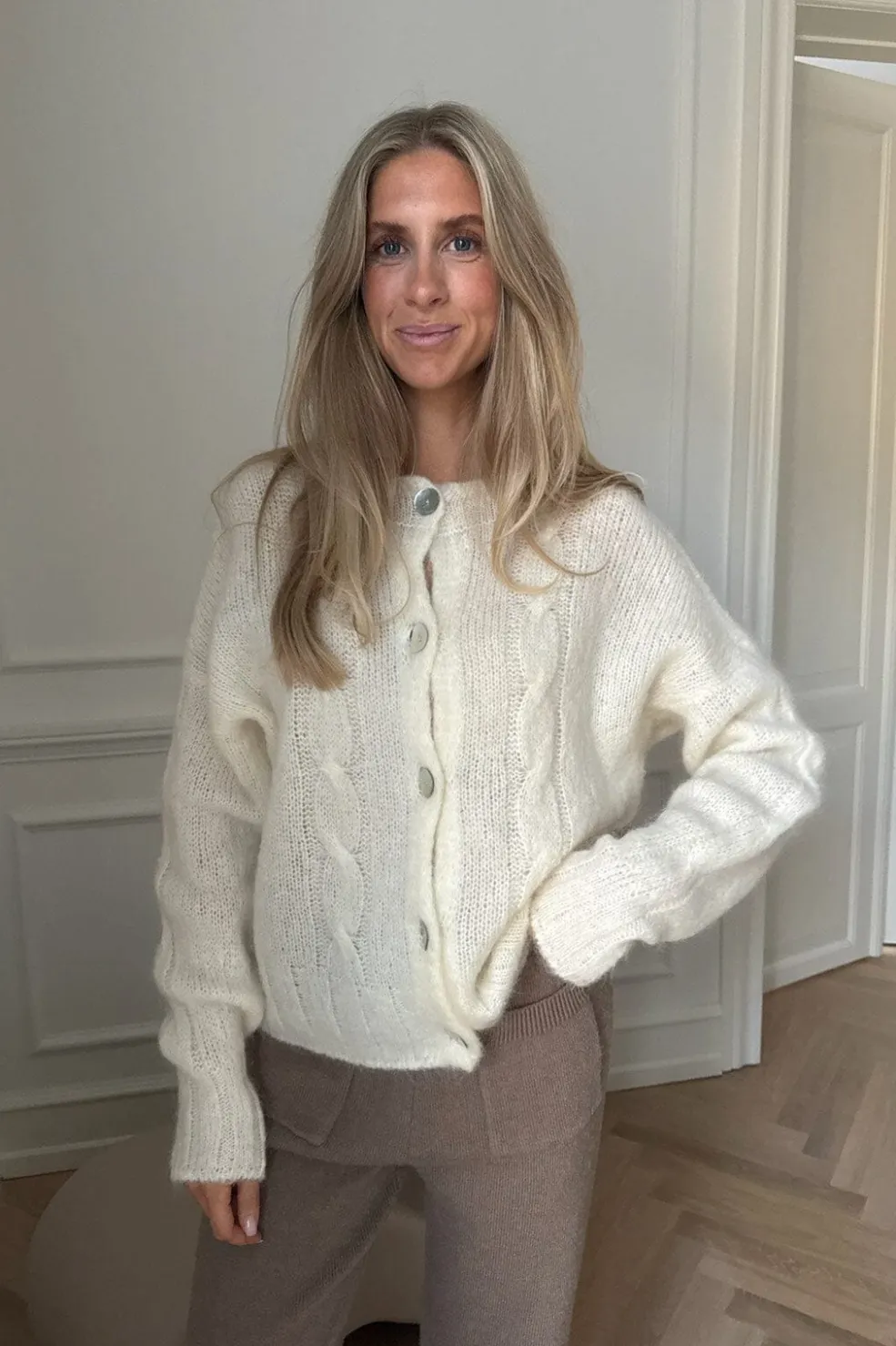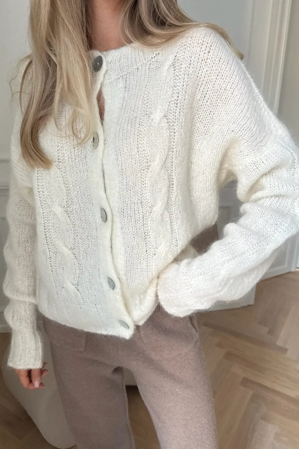 Hvid cardigan fra BYIC med kabelstrik og perledetaljer. Den er strikket i en blanding af mohair og naturfibre, som giver et blødt og fluffy udtryk.