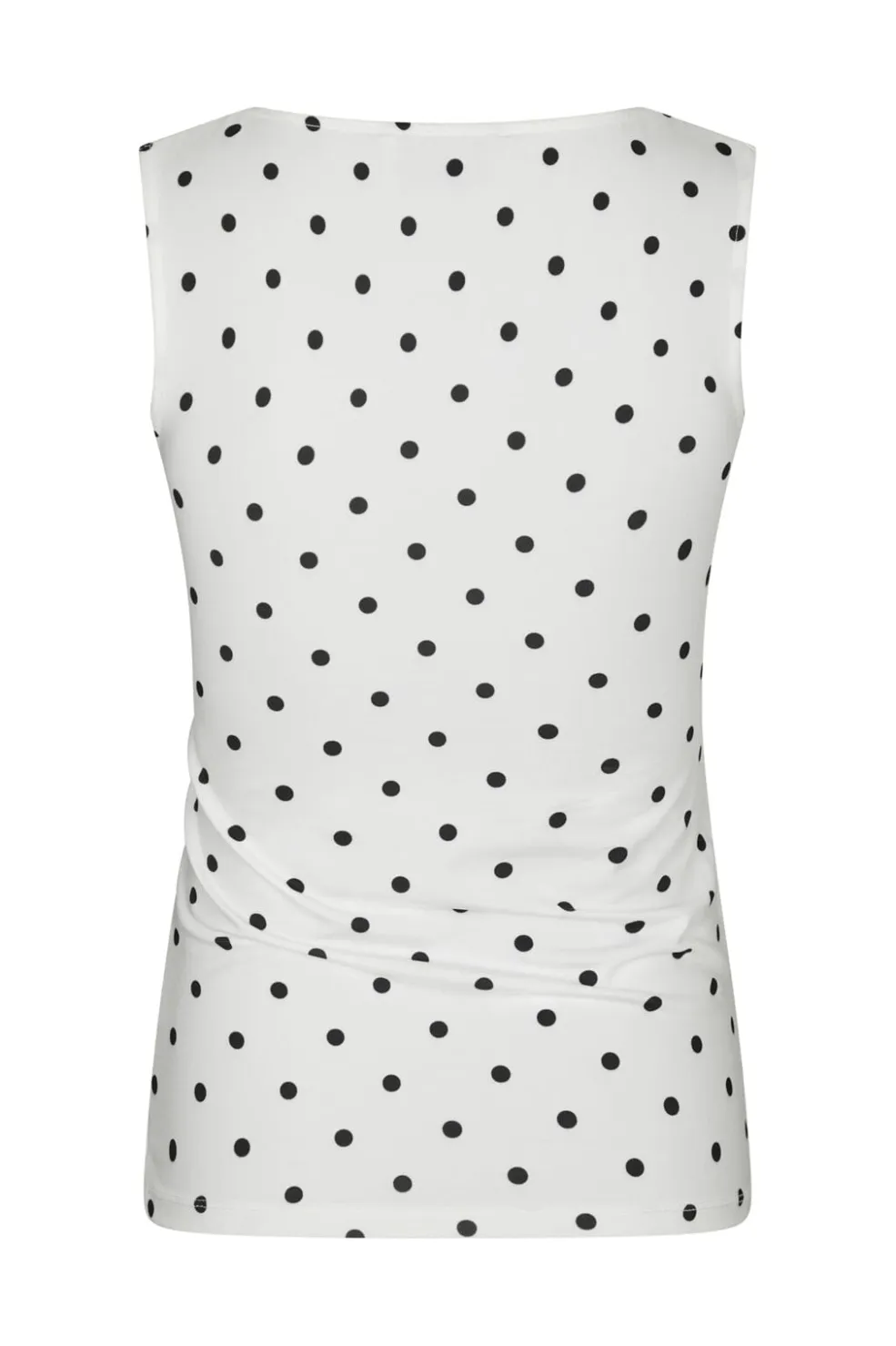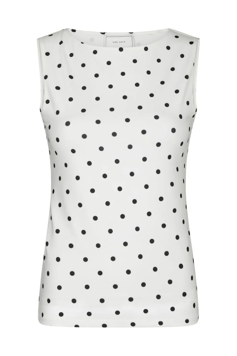 Hvid jersey-top fra Neo Noir med sorte polkaprikker. Toppen har en tætsiddende pasform og er ærmeløs med rund halsudskæring.