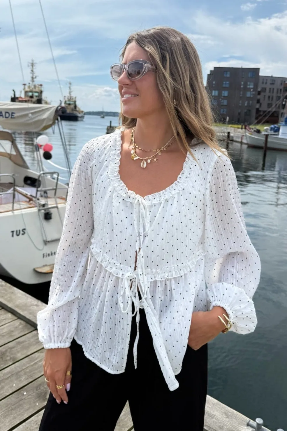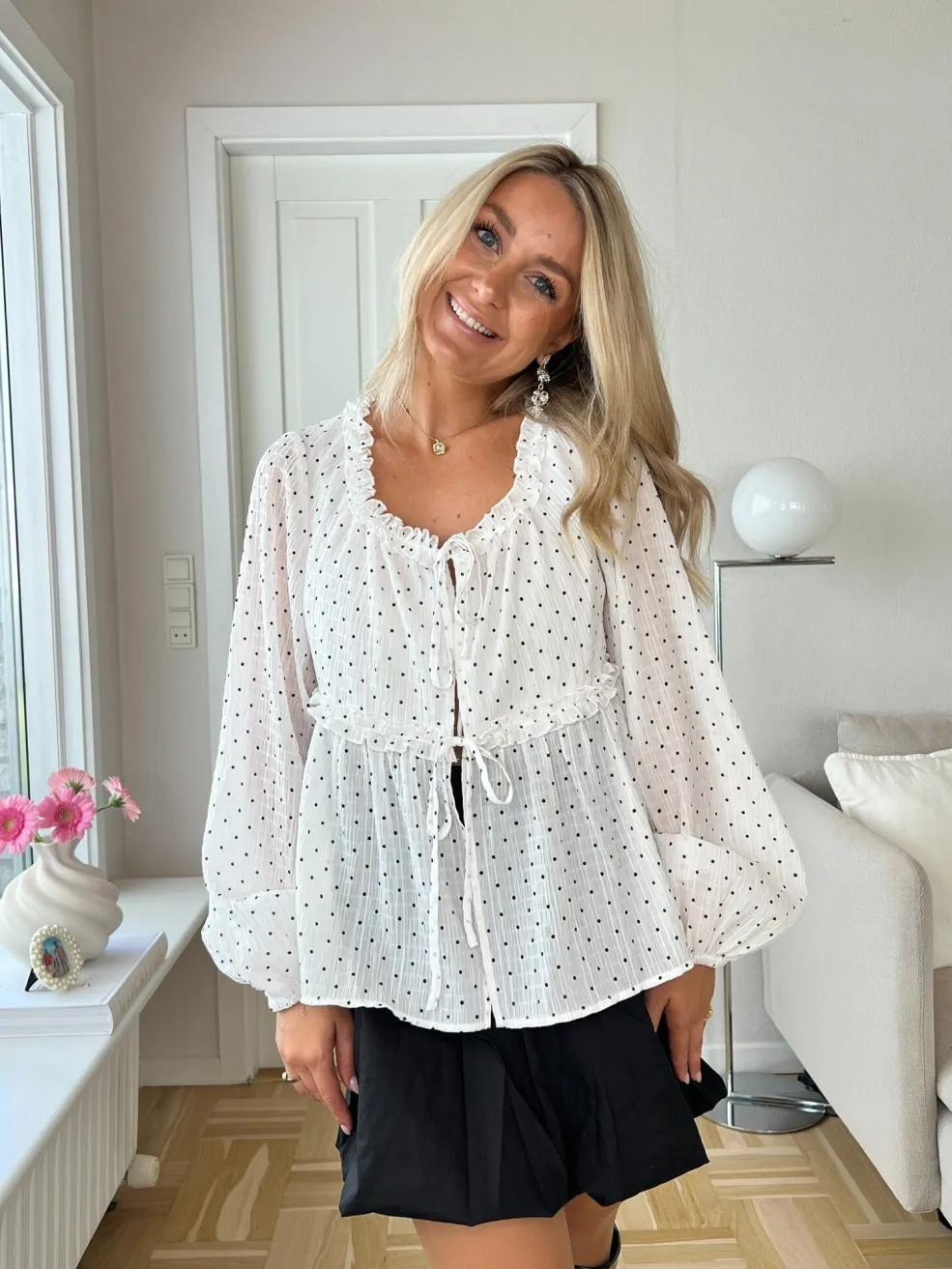 Hvid bluse med sorte prikker fra Dear Molly. Blusen har lange ærmer og en rund halsudskæring med flæser.