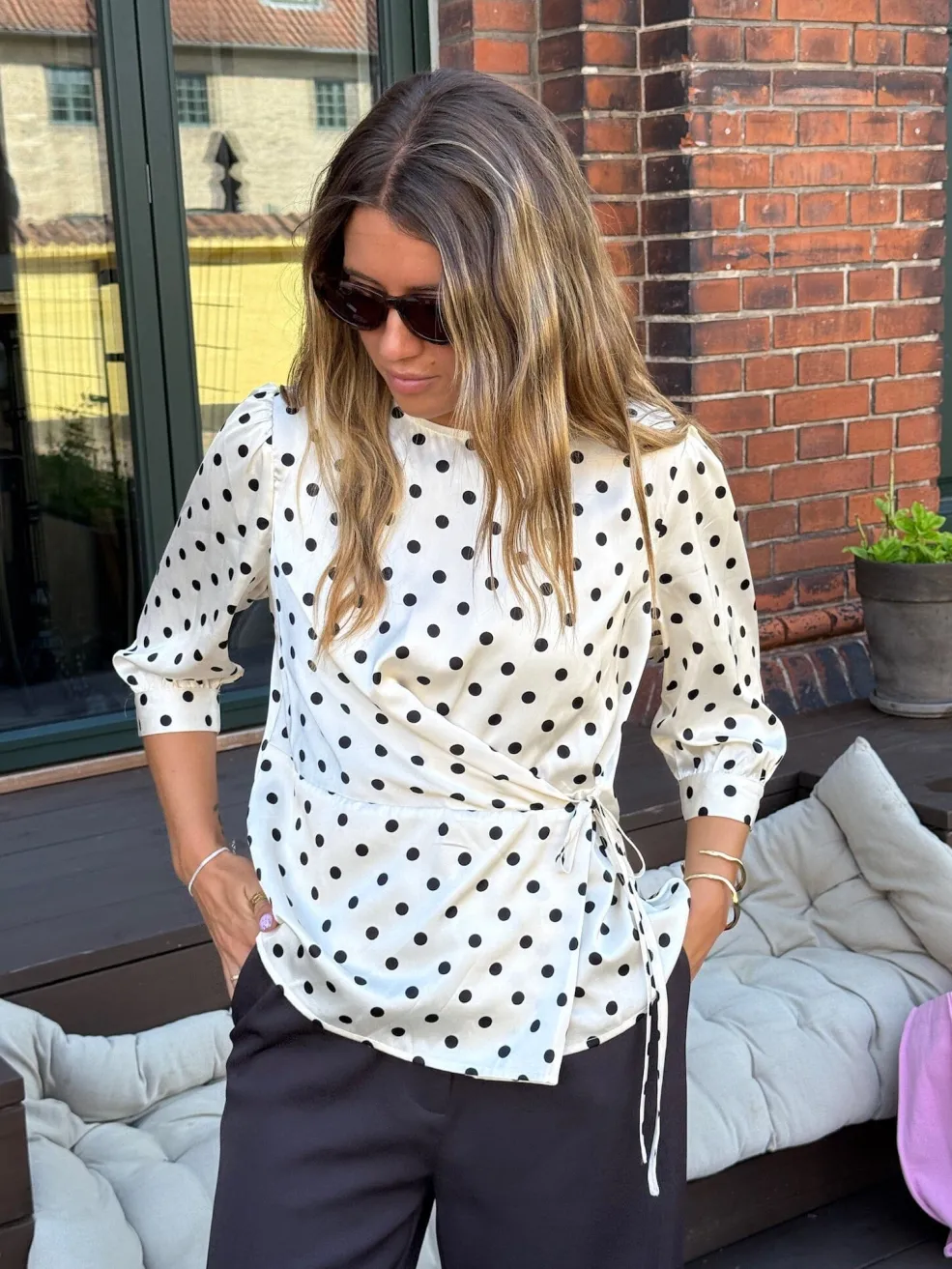 Hvid top fra Dear Molly med sorte prikker. Toppen har trekvartlange ærmer, rund hals og bindebåndsdetalje i taljen. Den har en almindelig pasform.