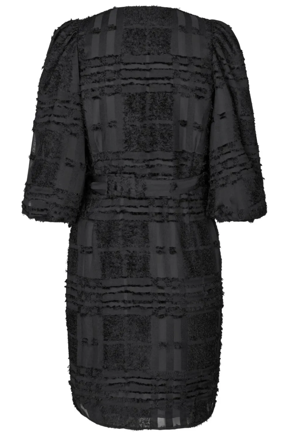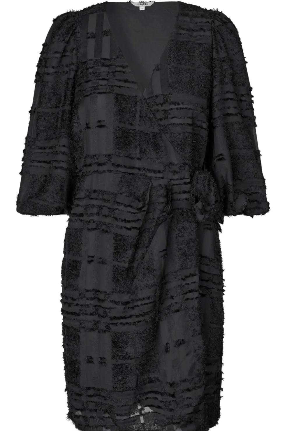 Sort kjole fra MbyM med trekvartlange ærmer og omslagsdesign. Kjolen har en struktureret overflade med striber og fuzzy detaljer samt V-halsudskæring.