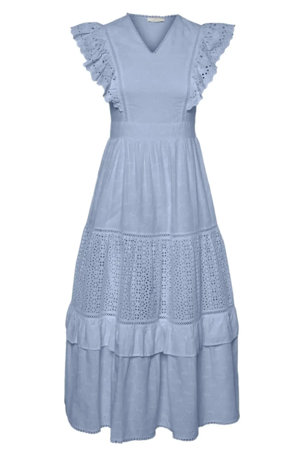 Lang kjole fra Y. A.S i lyseblå. Kjolen har en V-udskæring, korte ærmer med flæser og et langt snit med blondedetaljer og udskæringer.