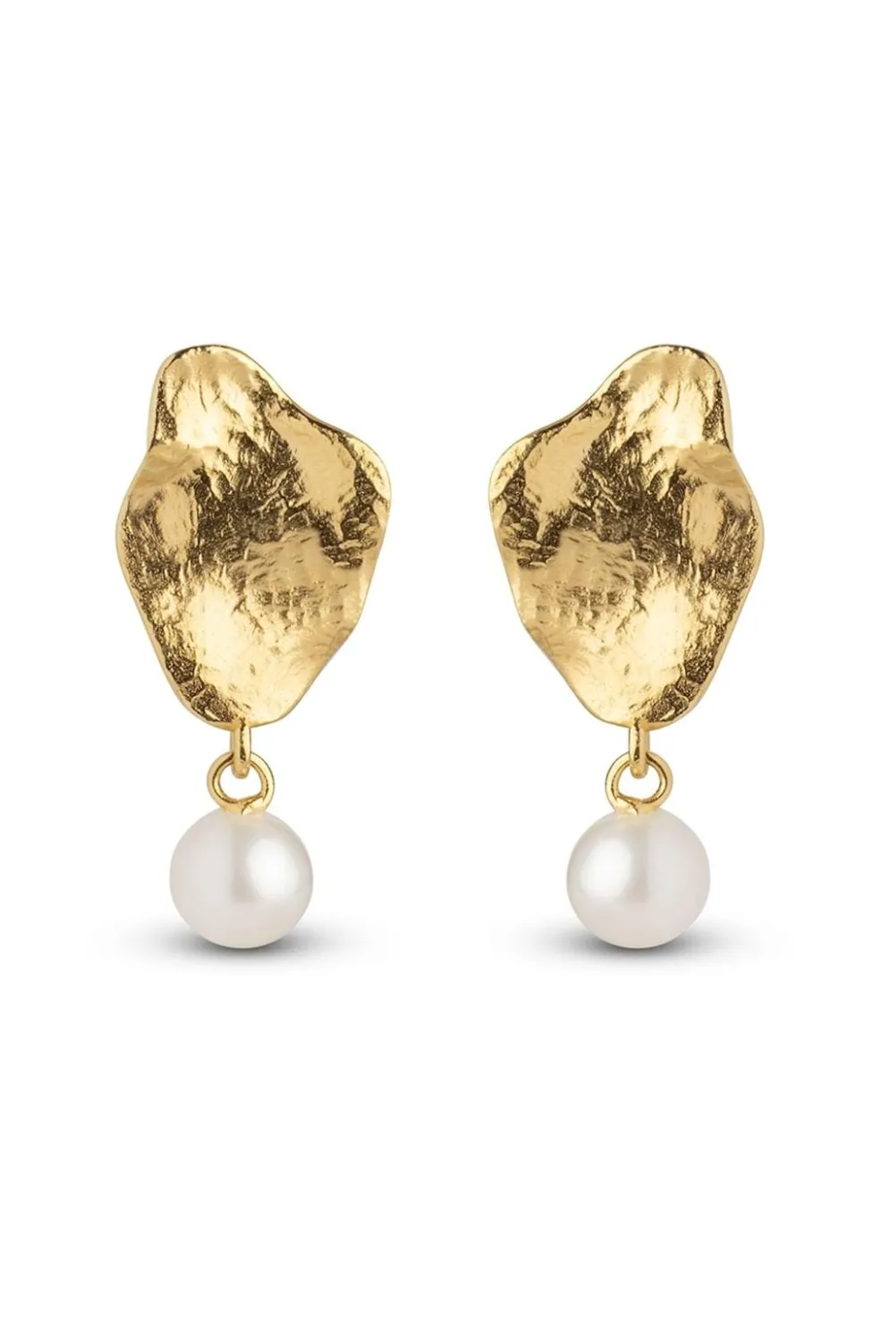 Øreringe fra Enamel Copenhagen med en bølget overflade i guldbelagt sølv. En hvid ferskvandsperle hænger fra den organiske guldplade.