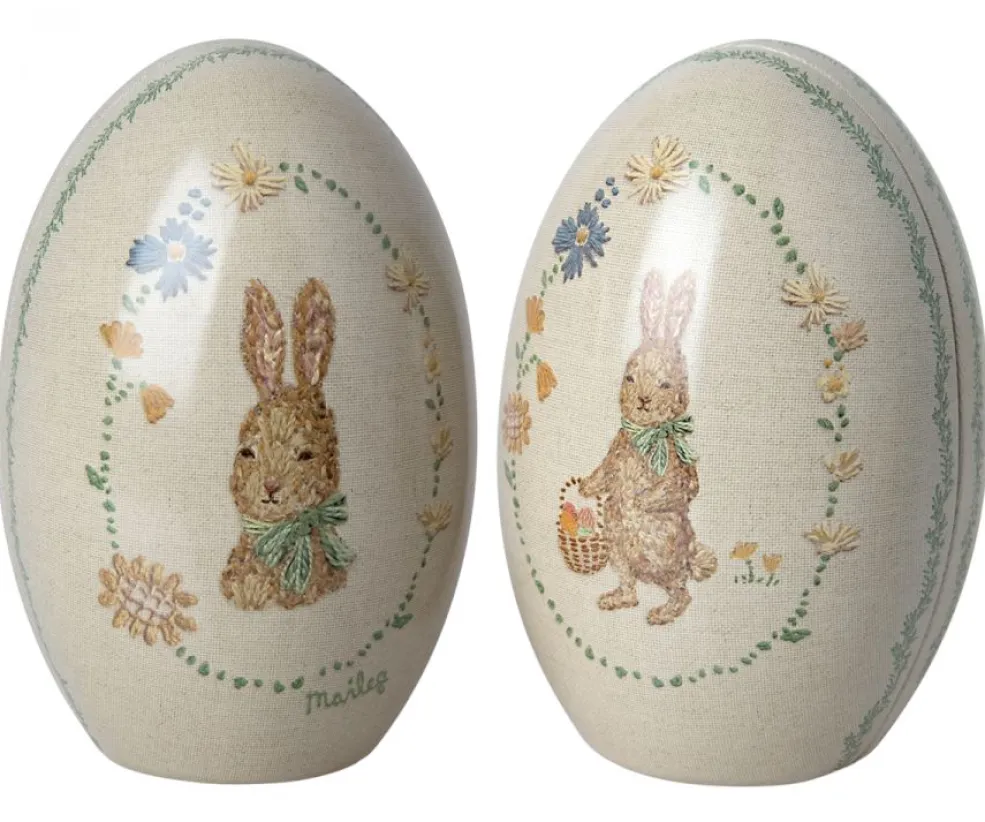 Dekorative metalæg fra Maileg med kaninmotiver og blomsterdesign. Æggene har mønstre på indersiden og er fremstillet i fødevaregodkendt metal til påskedekoration.