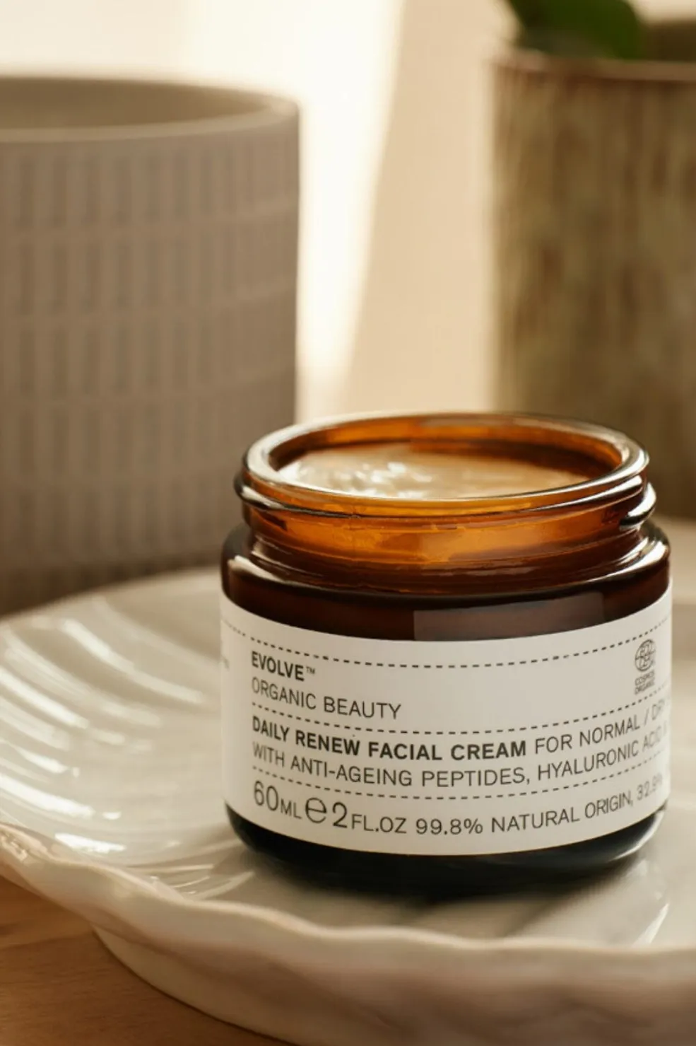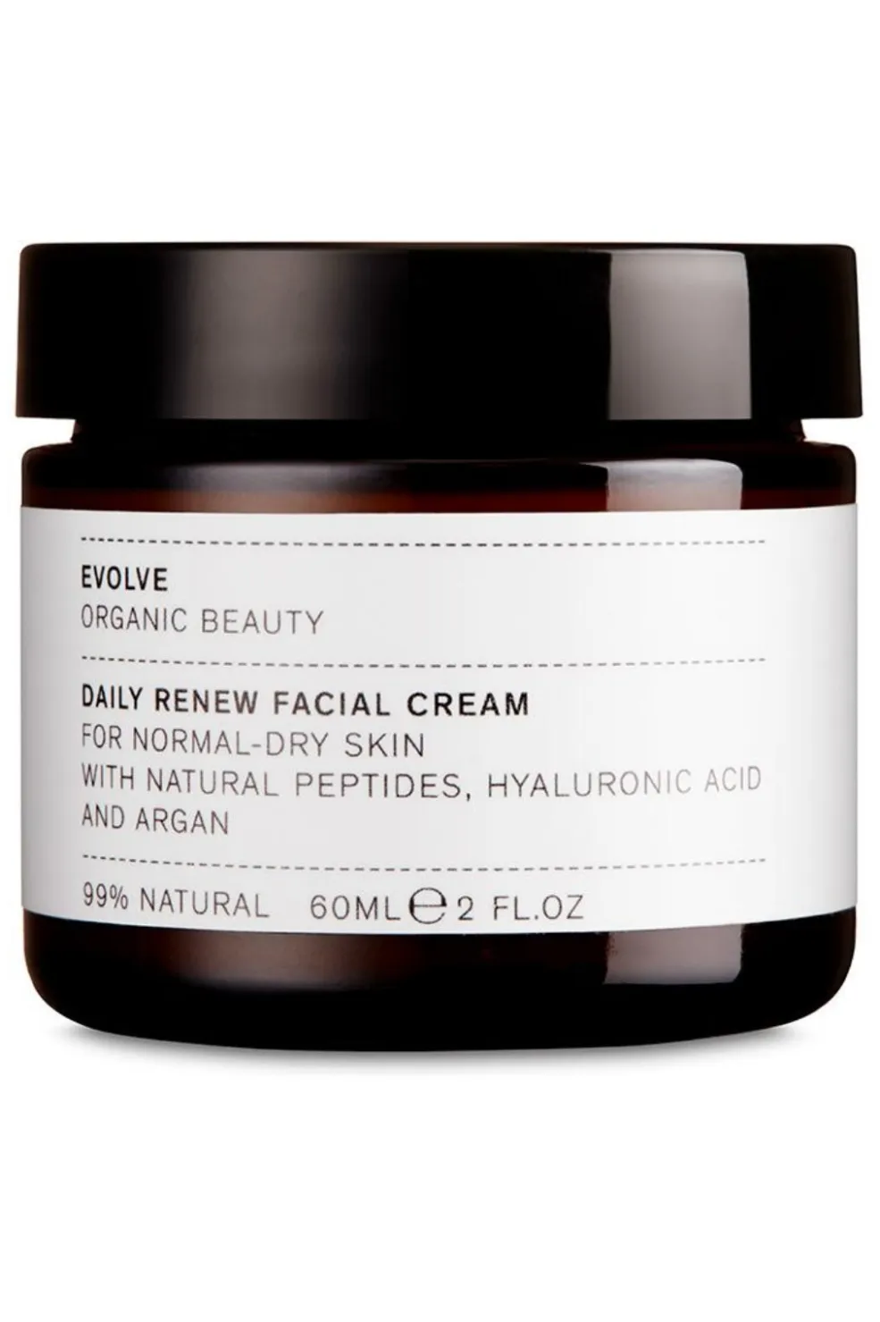 Ansigtscreme fra Evolve med naturlige og økologiske ingredienser. Cremen indeholder hyaluronsyre og peptider, der styrker hudens naturlige fugtbalance.