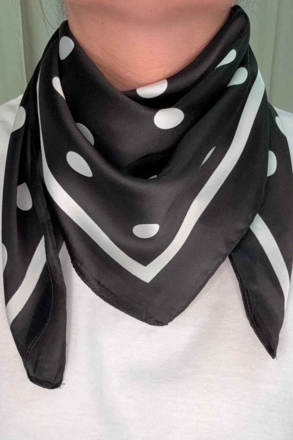 Sort tørklæde fra A-bee med hvide prikker og kant. Tørklædet har et klassisk polkaprik-design og kan bruges både som halstørklæde og som taskedetalje.