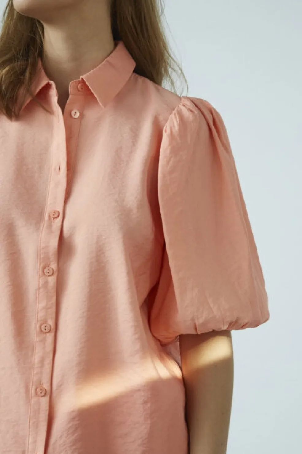 Koralfarvet skjorte fra Sisters Point med trekvartlange pufærmer og klassisk krave. Skjorten har knaplukning foran og en normal pasform.