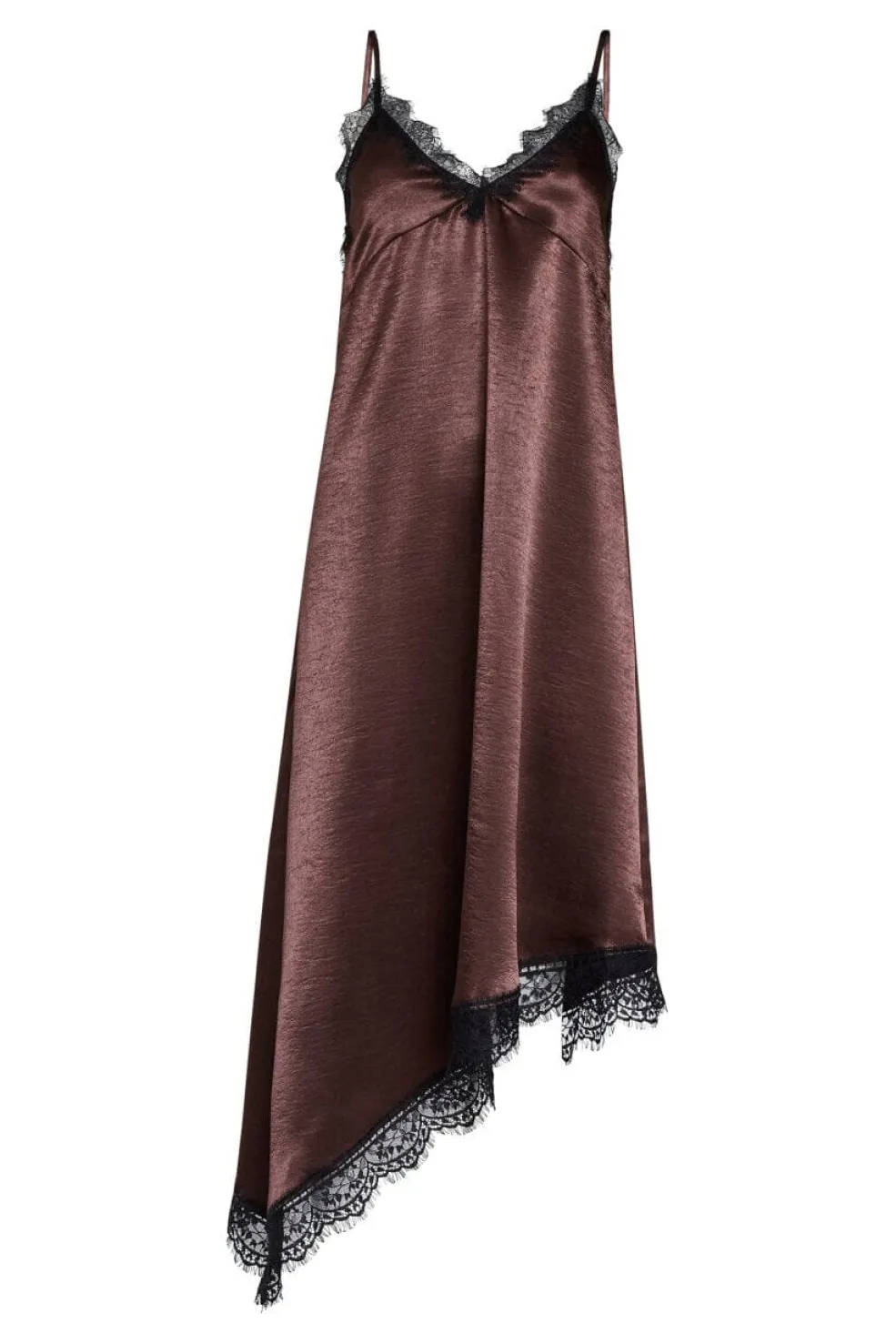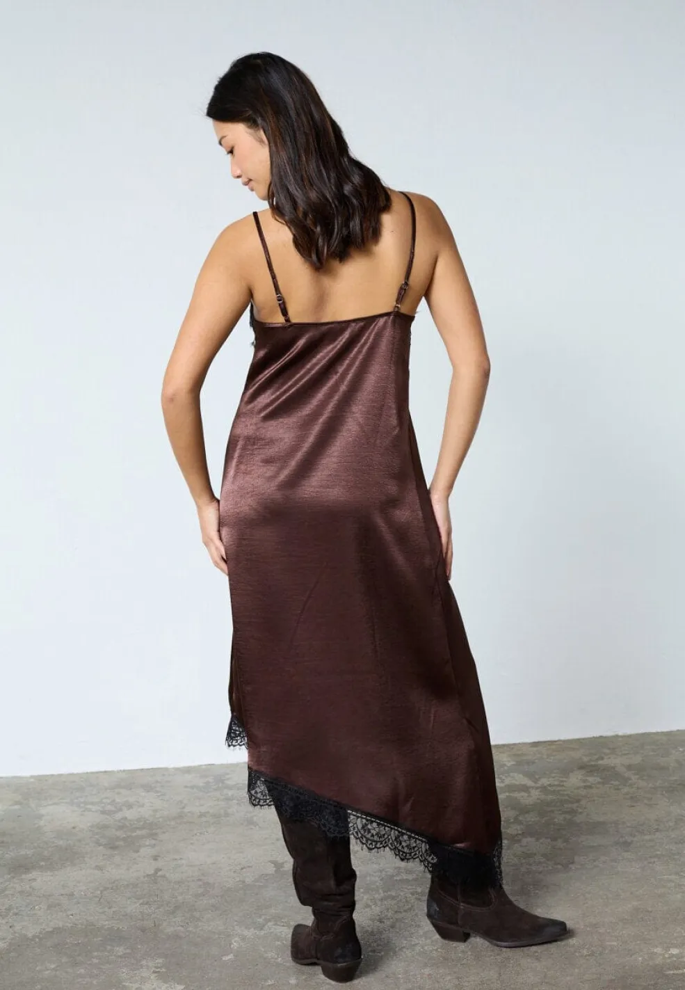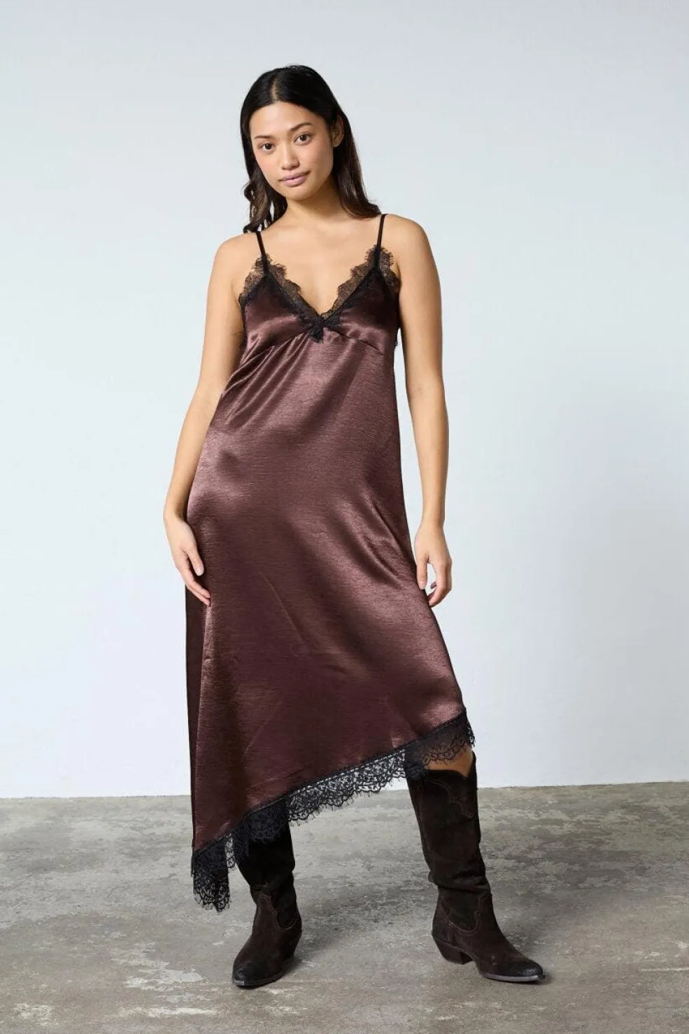 Lang kjole fra Sisters Point i brun og sort med skinnende satinlook. Materialet er lavet af 95% polyester og 5% elastan.