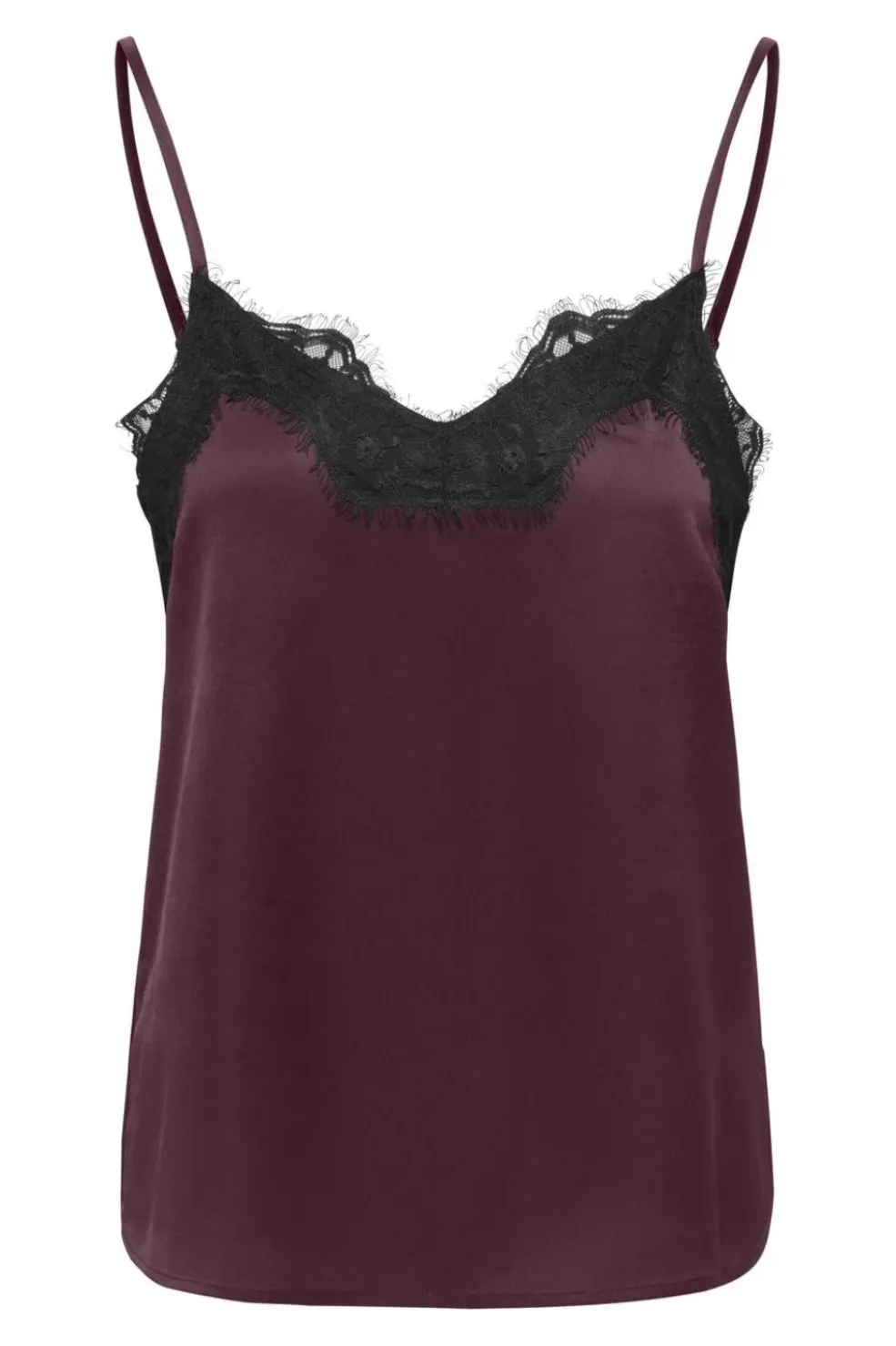 Singlet fra JDY i dyb burgunderfarve med blondedetaljer. Toppen er lavet af 100 % polyester og har tynde, justerbare stropper.