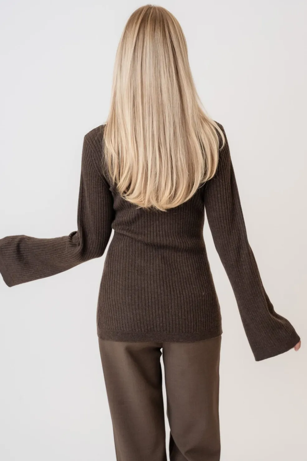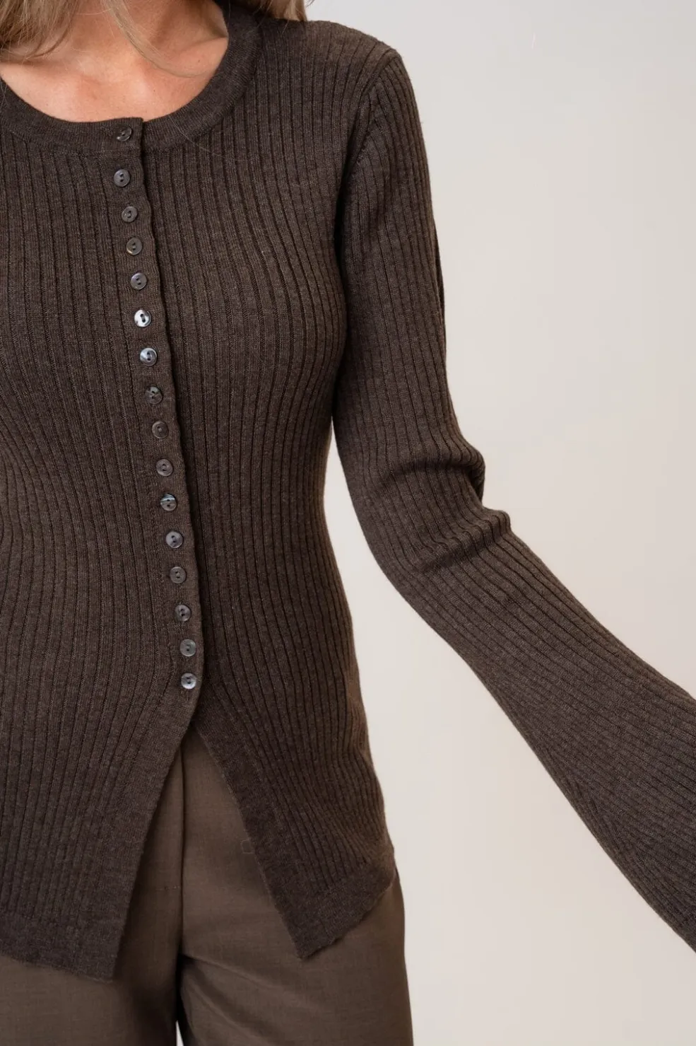 Mørkebrun cardigan fra BYIC med ribstrikket tekstur. Den har en rund halsudskæring og små, skinnende knapper hele vejen ned foran. Ærmerne er let svajede ved manchetterne.