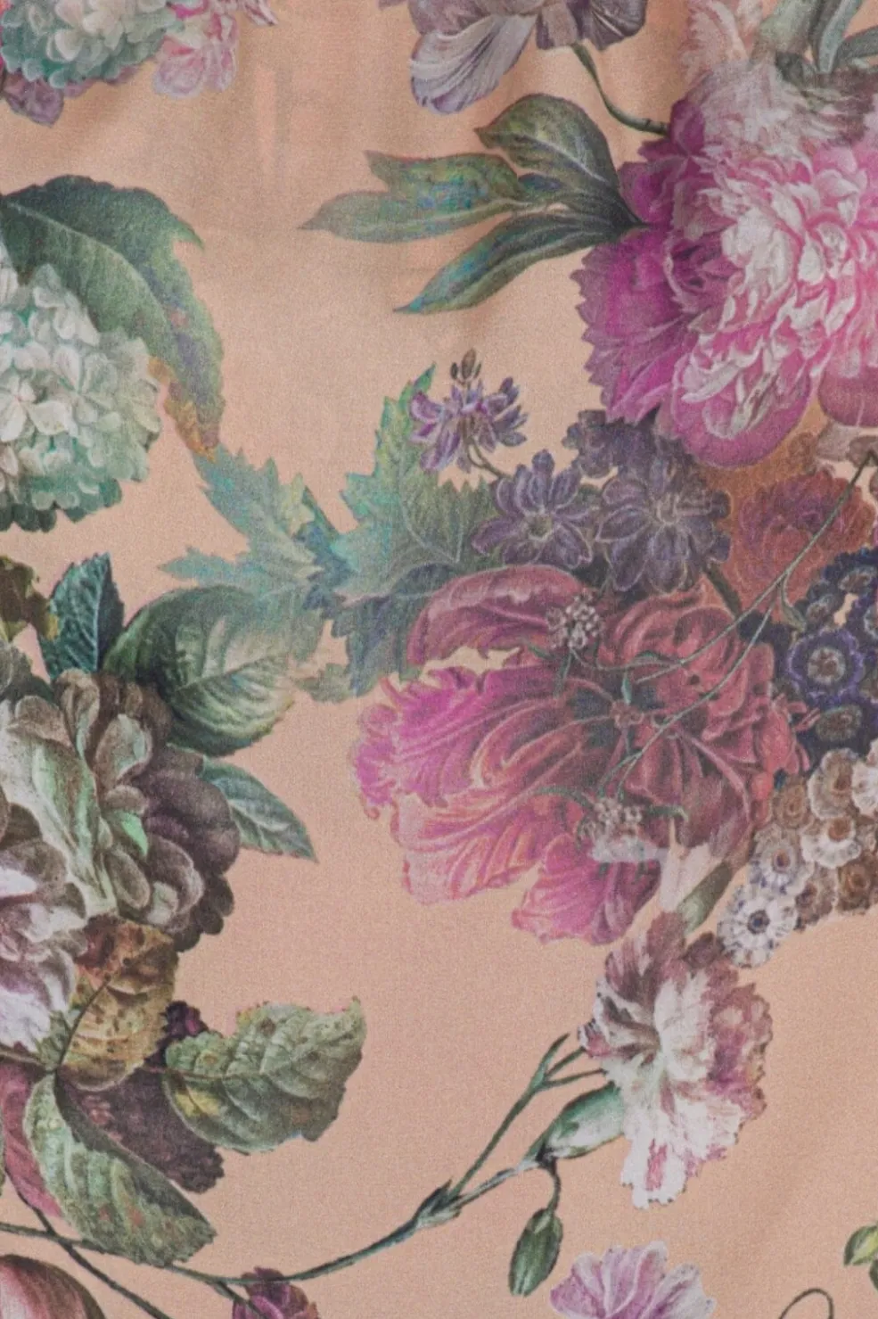 Ferskenfarvet top fra Karmamia med blomsterprint i rosa, lilla og grønne nuancer. Toppen har høj hals med bindebånd i nakken og er udsmykket med sløjfer og flæser.