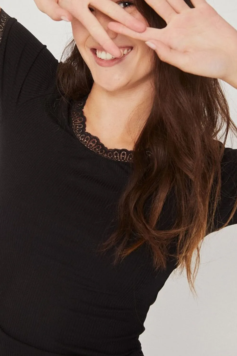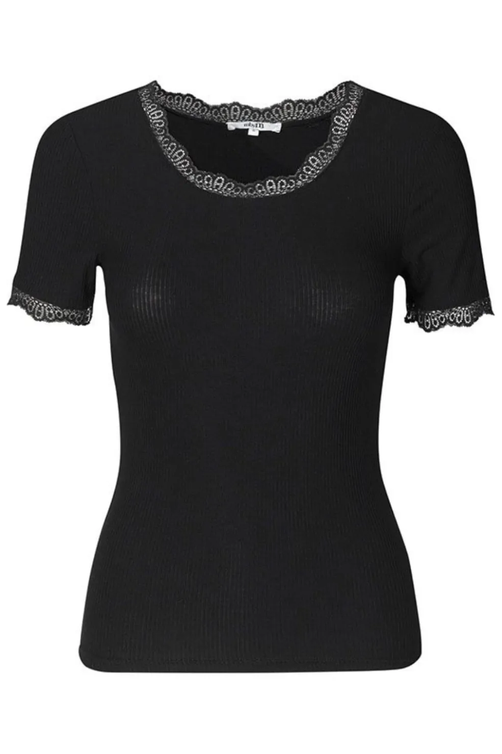 Sort t-shirt fra MbyM med ribbet tekstur. T-shirten har blondekanter ved halsen og ærmerne, slim fit pasform og kort ærmelængde med rund halsudskæring.