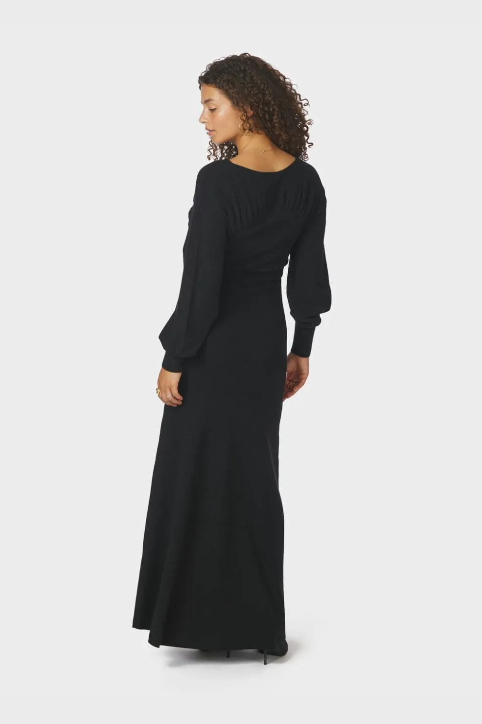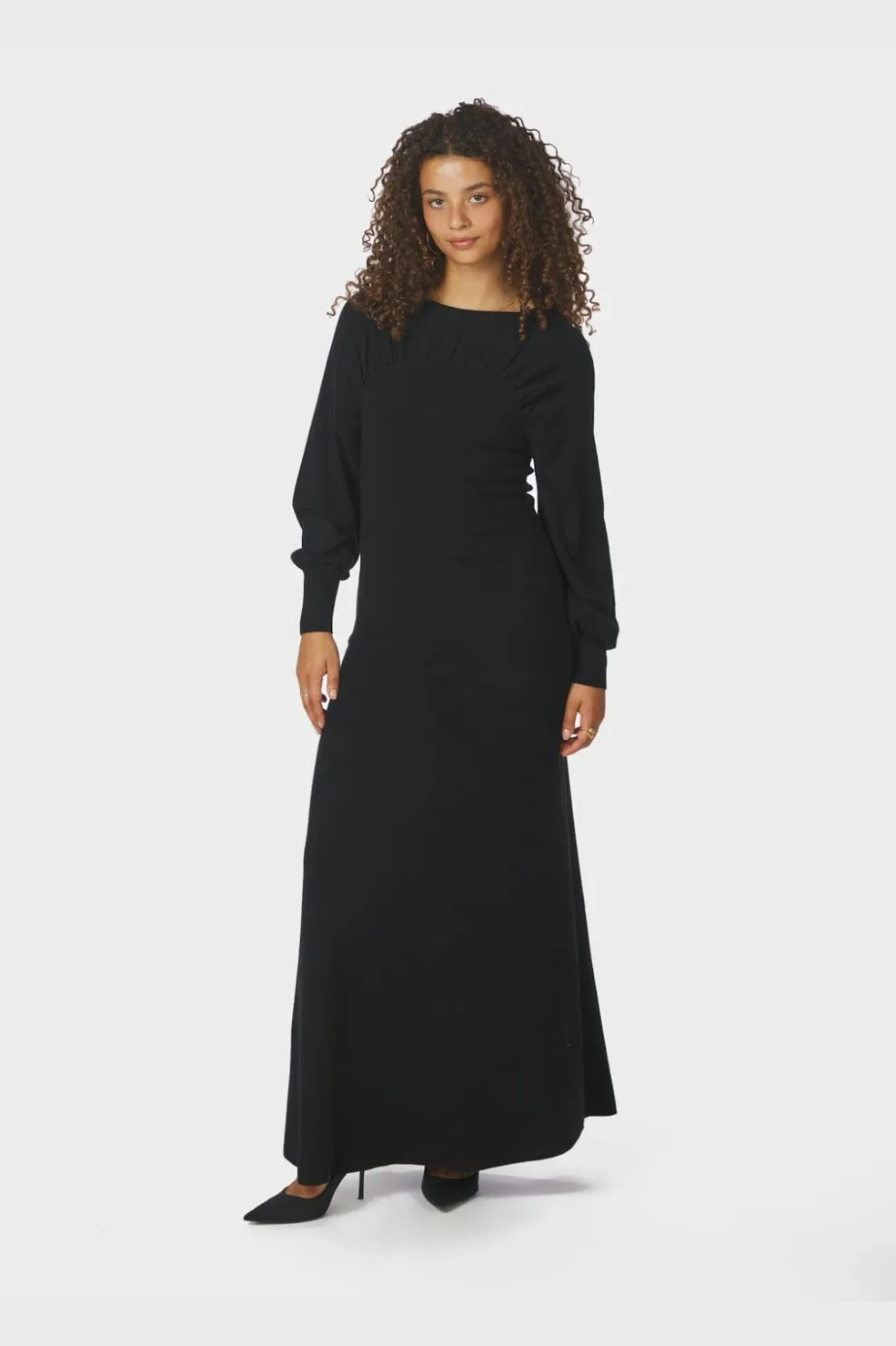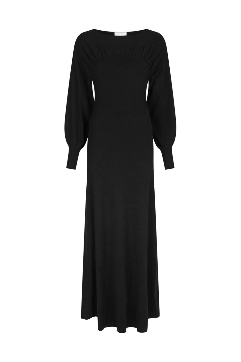 Sort strikket kjole fra Neo Noir med rynkedetalje ved halsudskæringen. Kjolen har brede ærmer og en let vidde i bunden, som giver god bevægelsesfrihed.