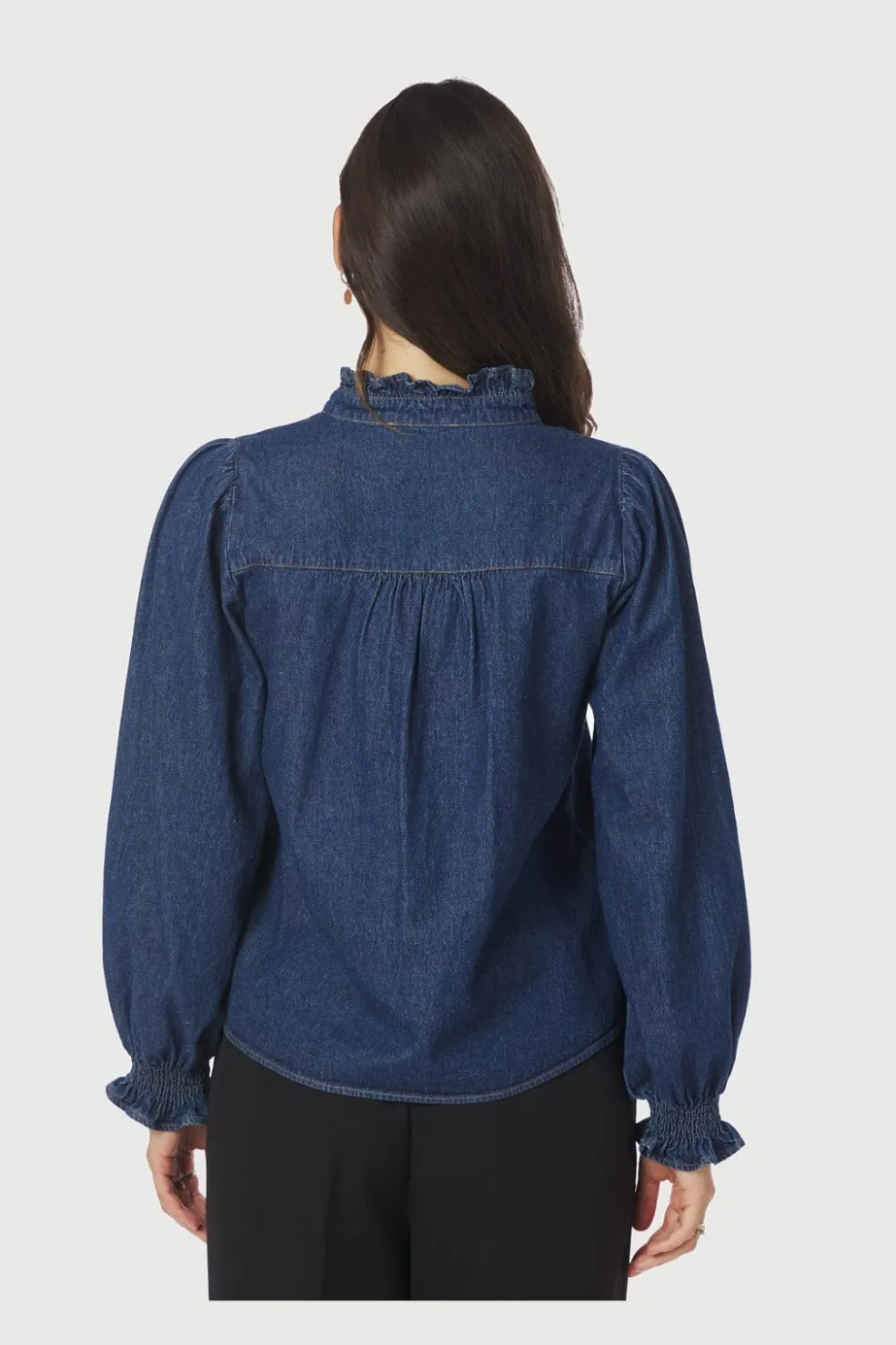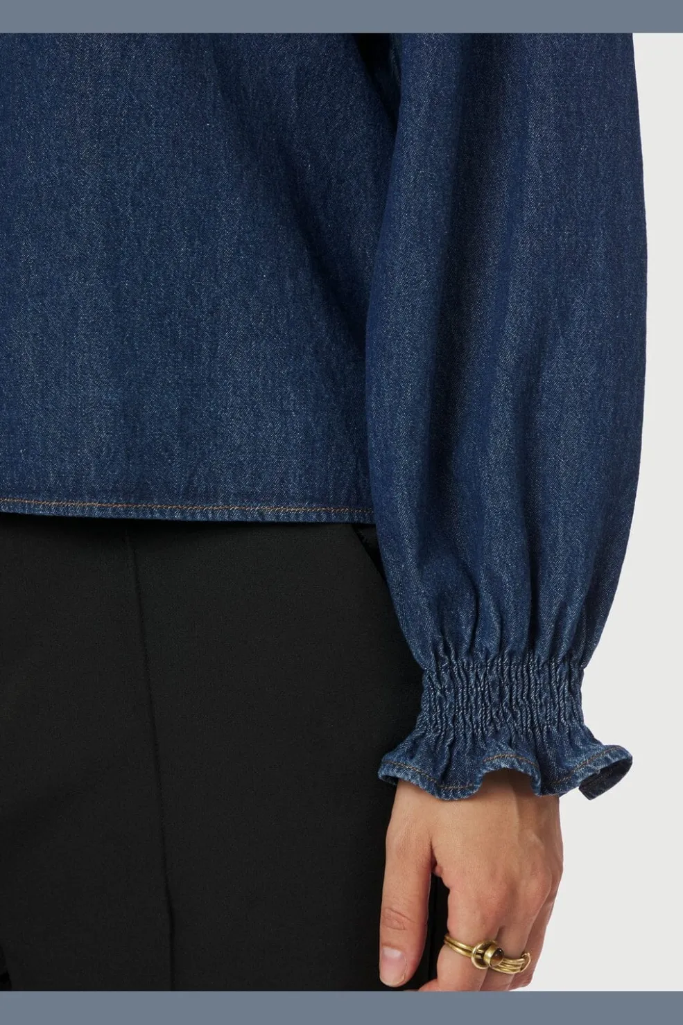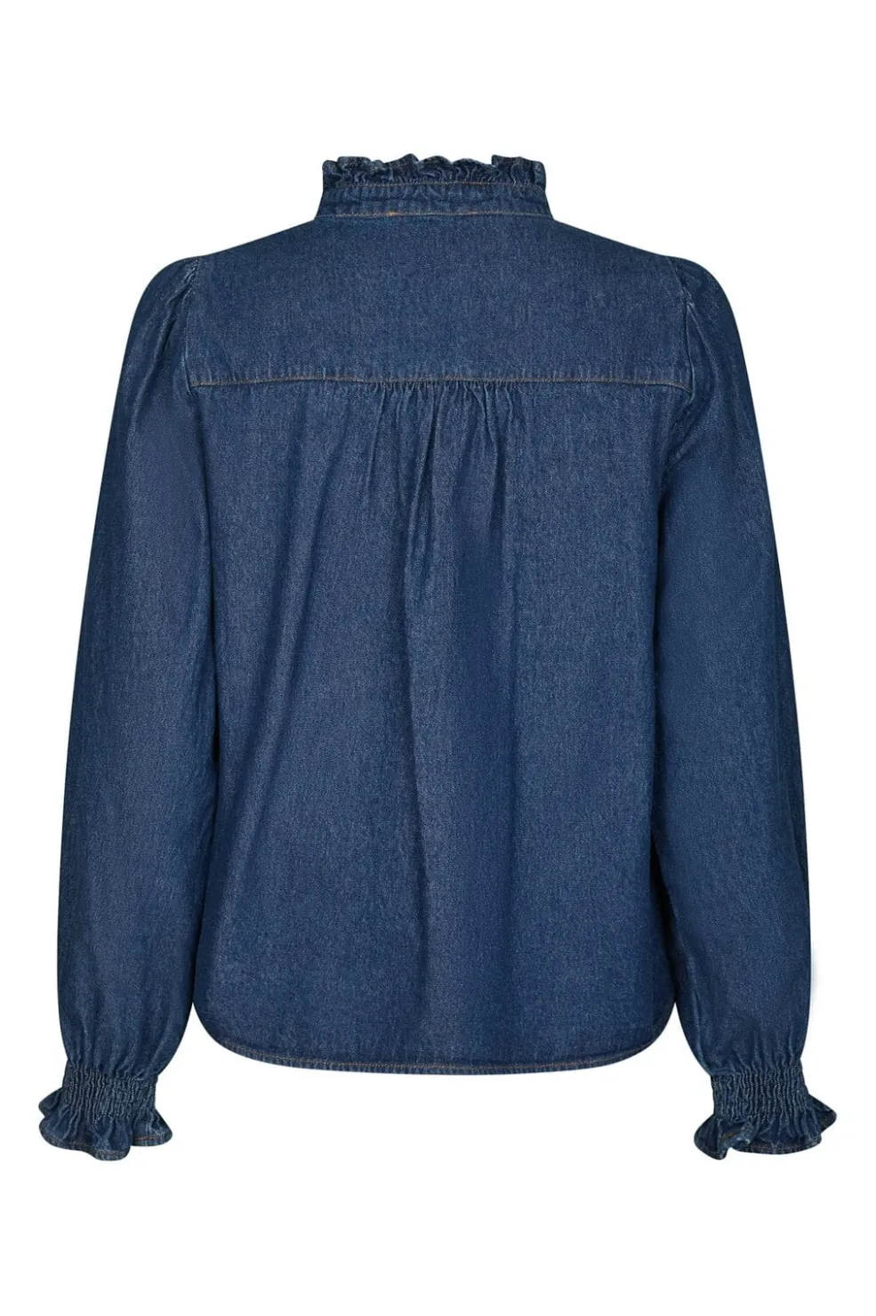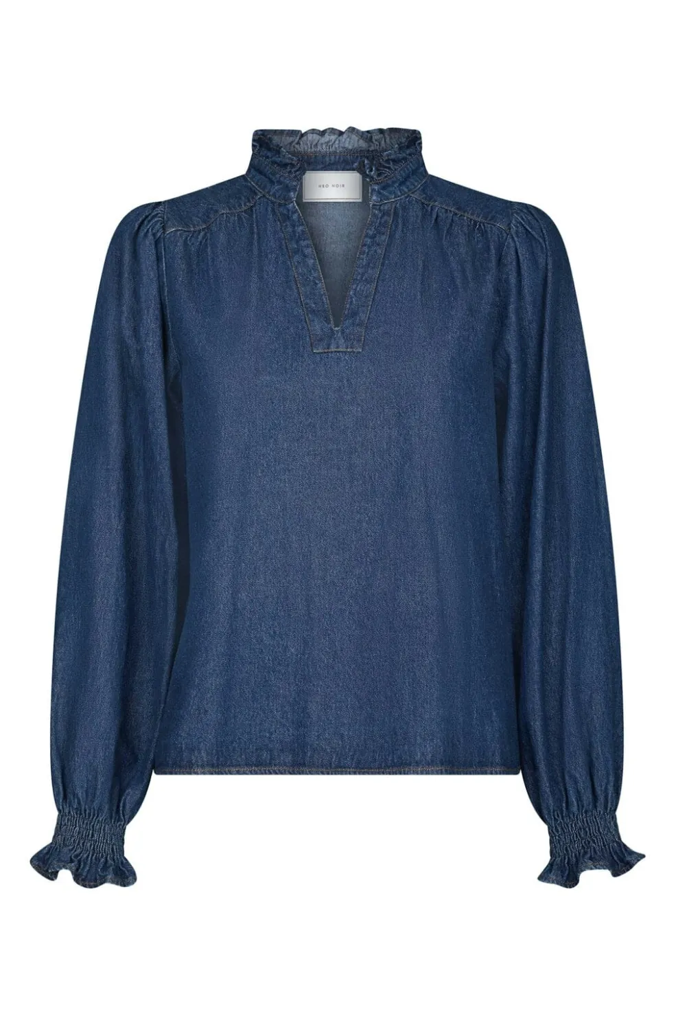 Denimbluse fra Neo Noir i mørkeblå. Blusen har lange ærmer, en høj halsudskæring og en løs pasform.
