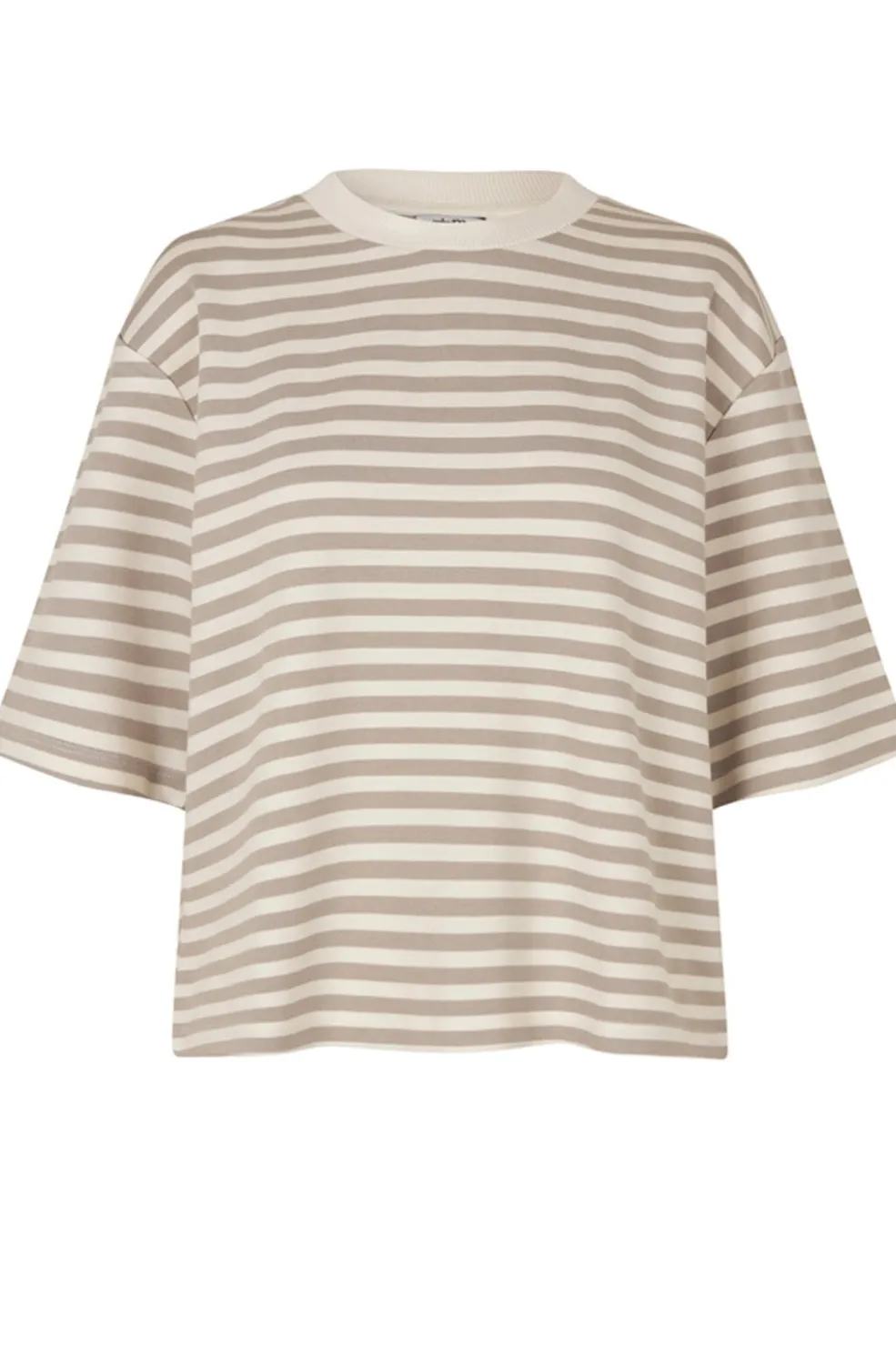 Stribet t-shirt fra MbyM med rund hals og korte ærmer. Den oversized t-shirt har et mønster i beige og cremefarvede striber på en lys baggrund.