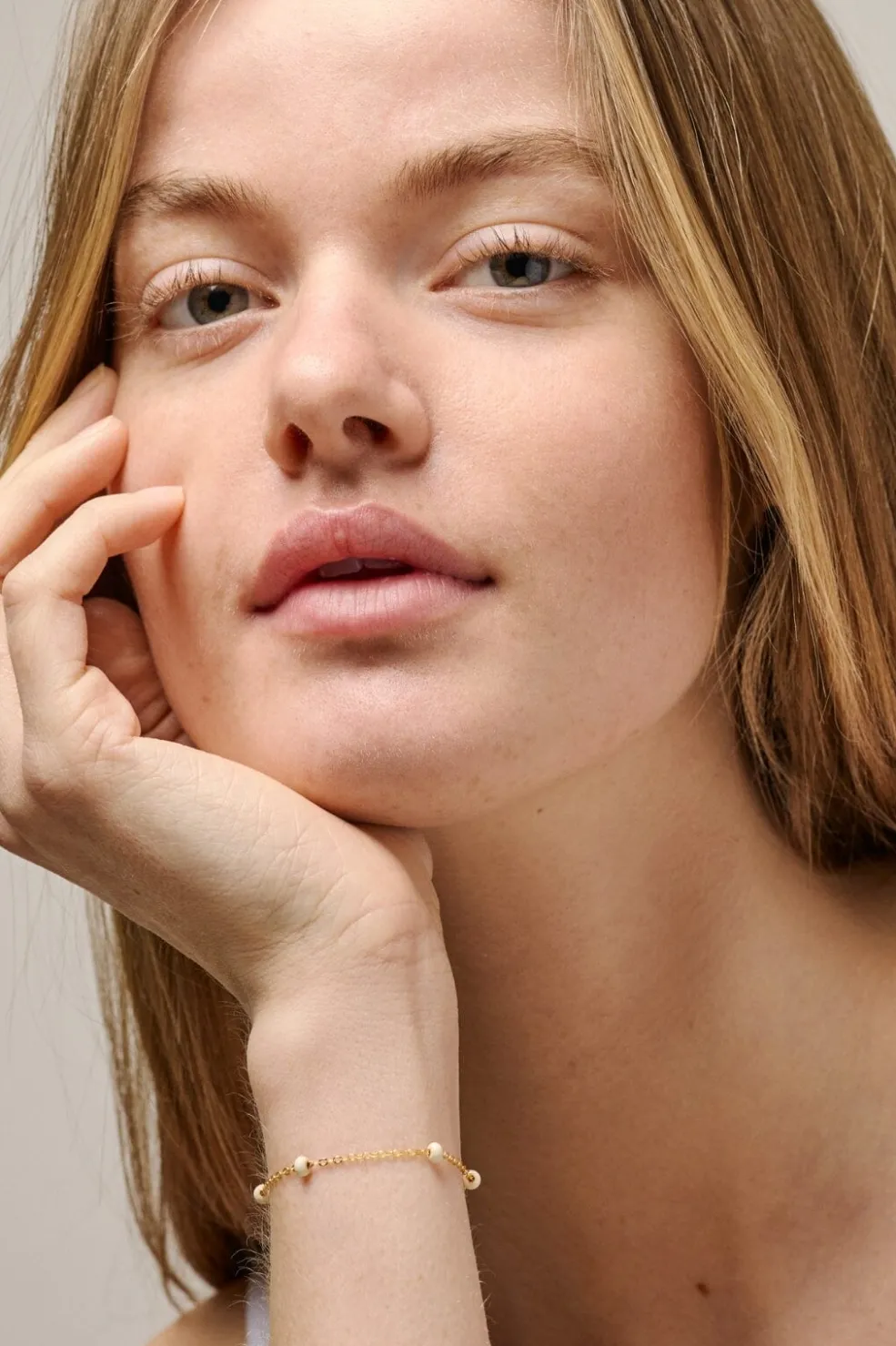 Guldbelagt armbånd fra Enamel Copenhagen med hvide emaljeperler. Armbåndet er fremstillet af 18K guldbelagt genanvendt sterling sølv med håndmalede perler langs kæden.