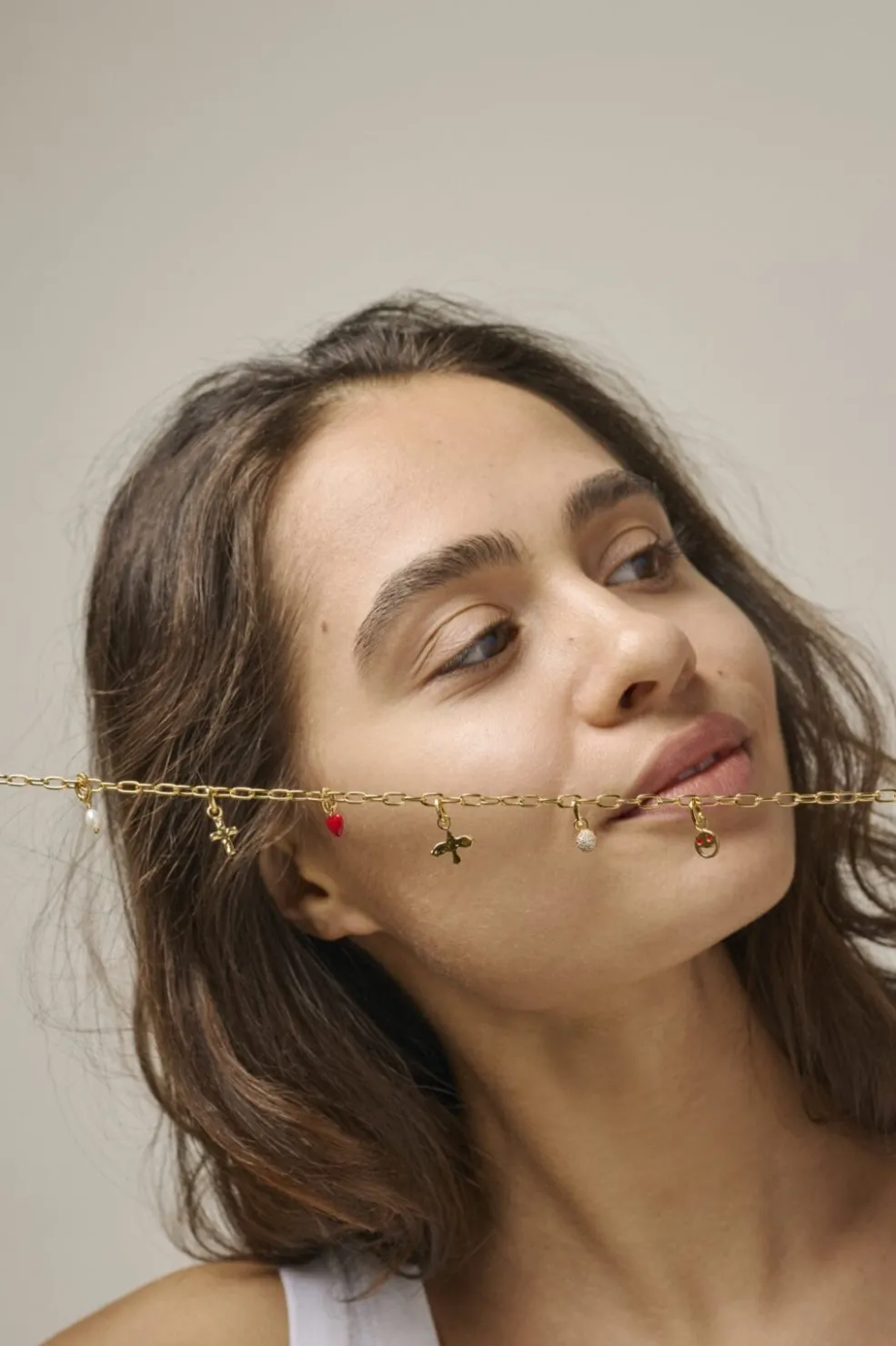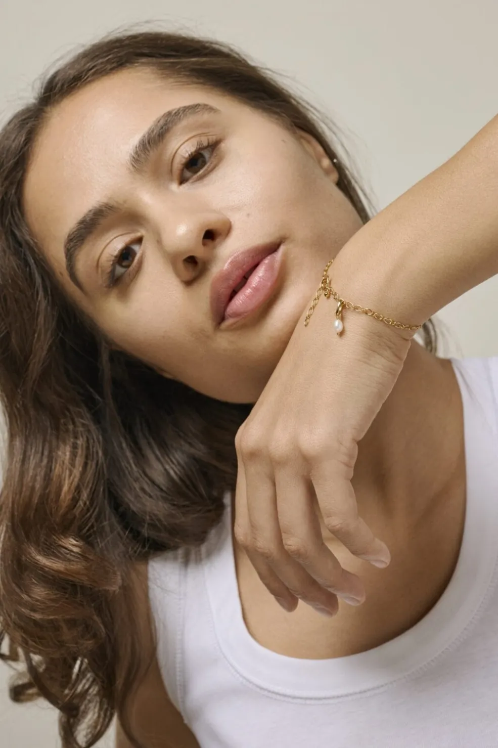 Charm fra Enamel Copenhagen med hvid perle og guldfarvet ring. Smykket er fremstillet i genanvendt sterling sølv med 18K guldbelægning og har en oval perle.