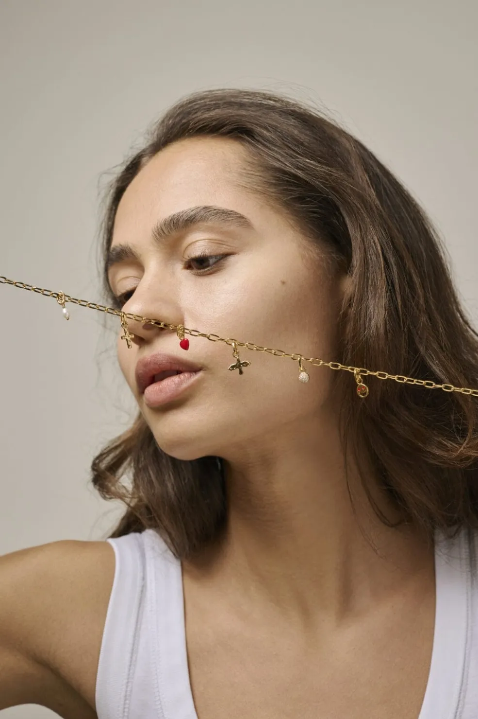 Gyldent korsvedhæng fra Enamel Copenhagen med en prægning på overfladen. Vedhænget er lavet i guldbelagt genanvendt sterling sølv og har en praktisk løkke til fastgørelse.