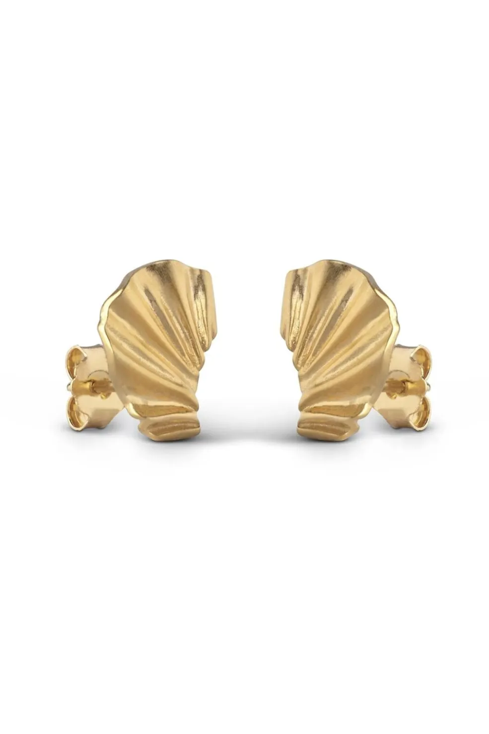 Guldfarvede øreringe fra Enamel Copenhagen med et bølgeformet muslingedesign. Øreringene er lavet af 18K guldbelagt sterling sølv med mat overflade.