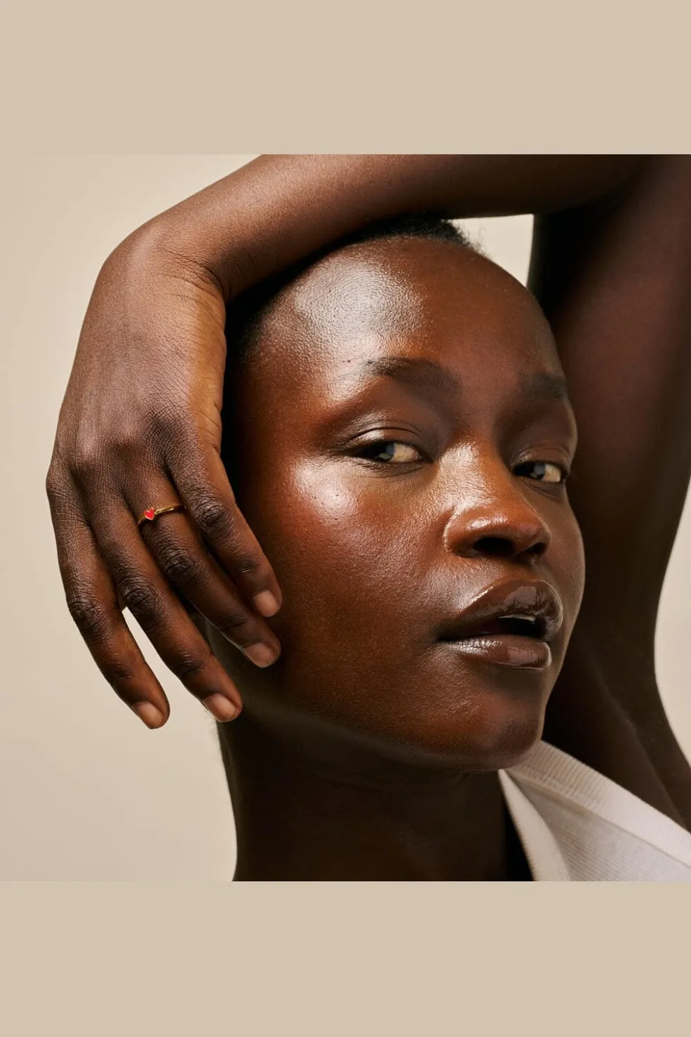 Ring fra Enamel Copenhagen med et rødt hjerteformet design. Den er fremstillet i genanvendt sterling sølv med 18K guldbelægning og har en åben ringform med en tynd, let profil.