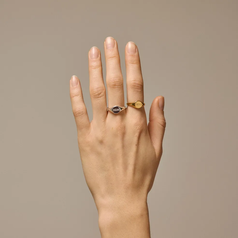 Signetring fra Enamel Copenhagen med oval form og indgravering. Ringen er designet til lillefingeren og fremstillet af genanvendt 925 sterling sølv med en poleret overflade.