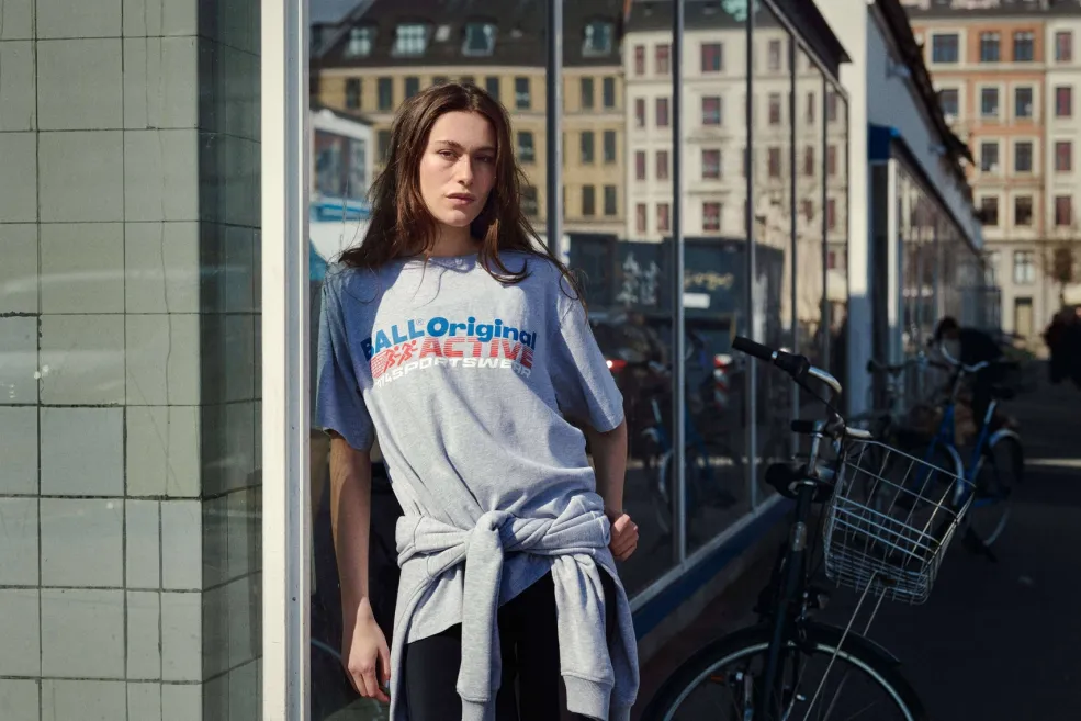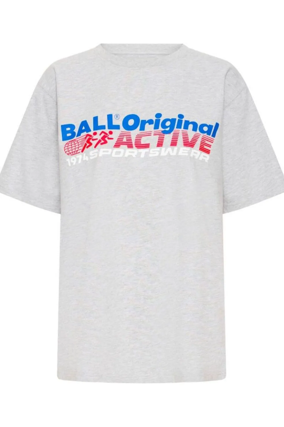 Grå melange t-shirt fra Ball med løs pasform. T-shirten har et grafisk print på forsiden i blå og rød med teksten BALL® Original ACTIVE samt 1974 SPORTSWEAR i hvid.