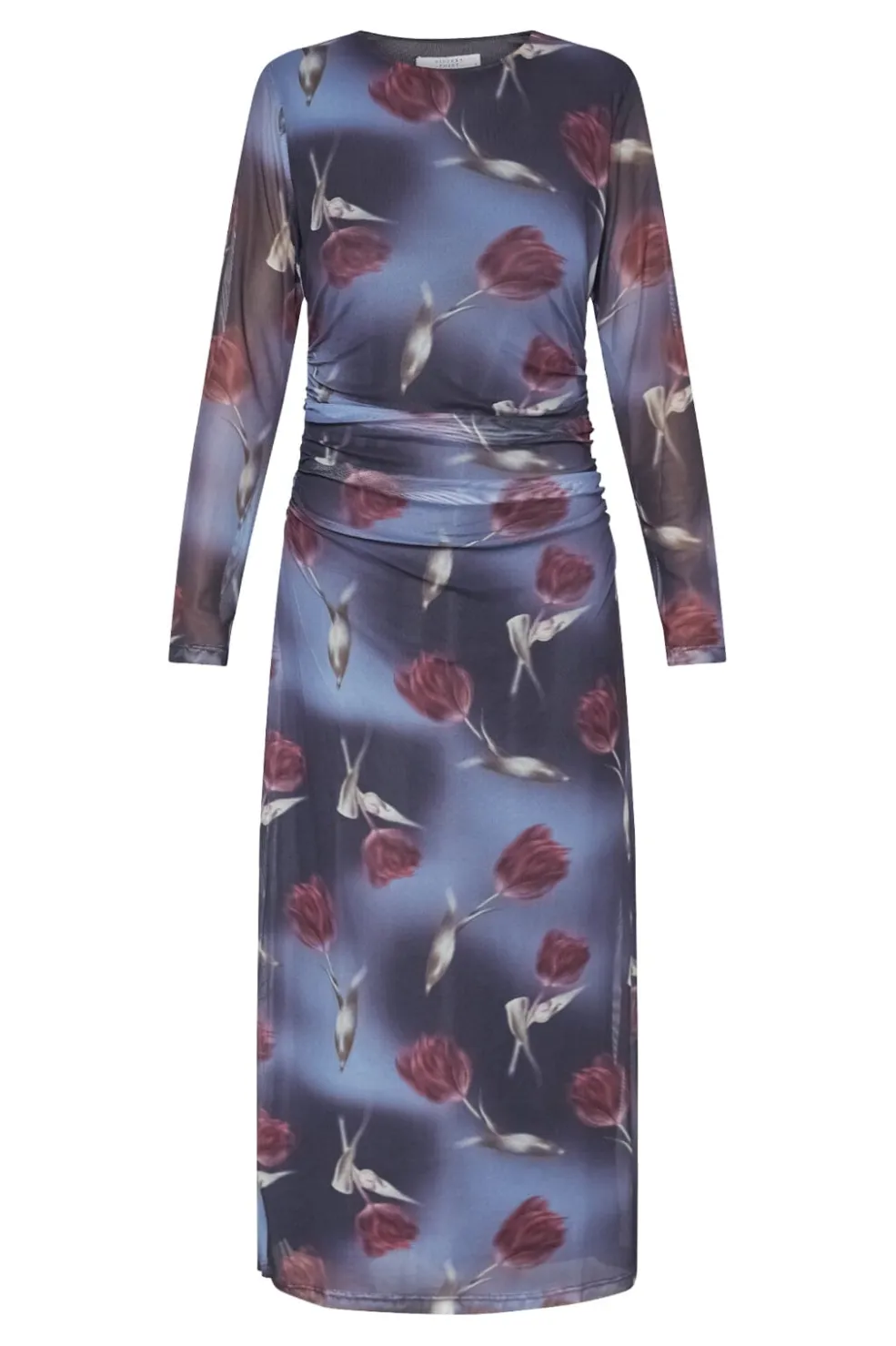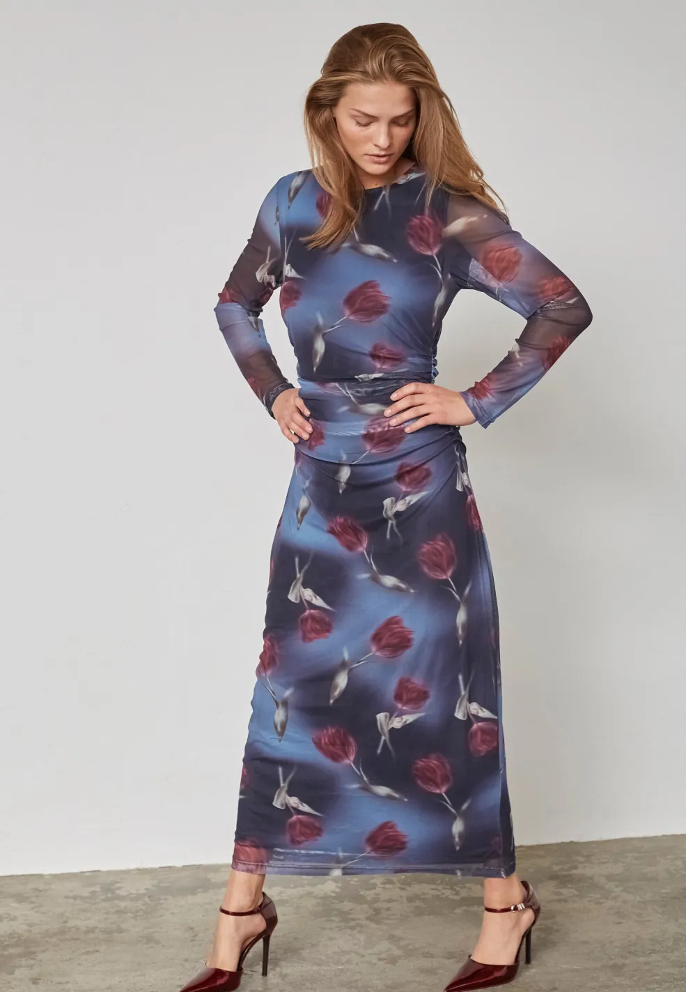 Langærmet kjole fra Sisters Point med et blomstermønster i bordeaux, rødt, lilla og blåt. Kjolen har en slank pasform og går til anklerne.