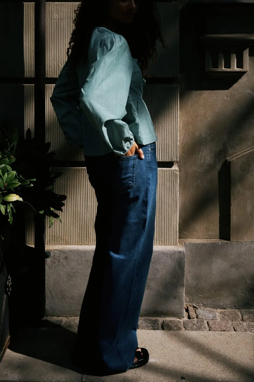 Grøn stribet bluse fra Neo Noir med peplum-design og flæser. Blusen har en v-halsudskæring og sløjfedetaljer, der giver den et personligt præg.