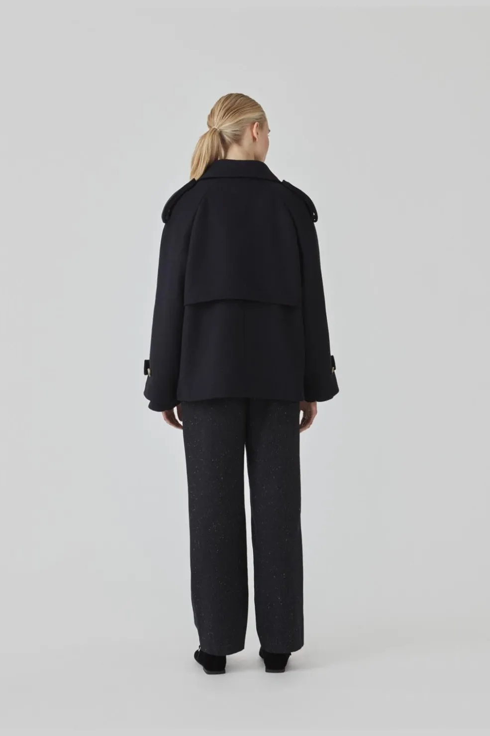 Mørkeblå jakke fra Modström med dobbeltradet design og skjulte knapper. Den har raglanærmer og et bredt bærestykke på ryggen samt et komplet foer.