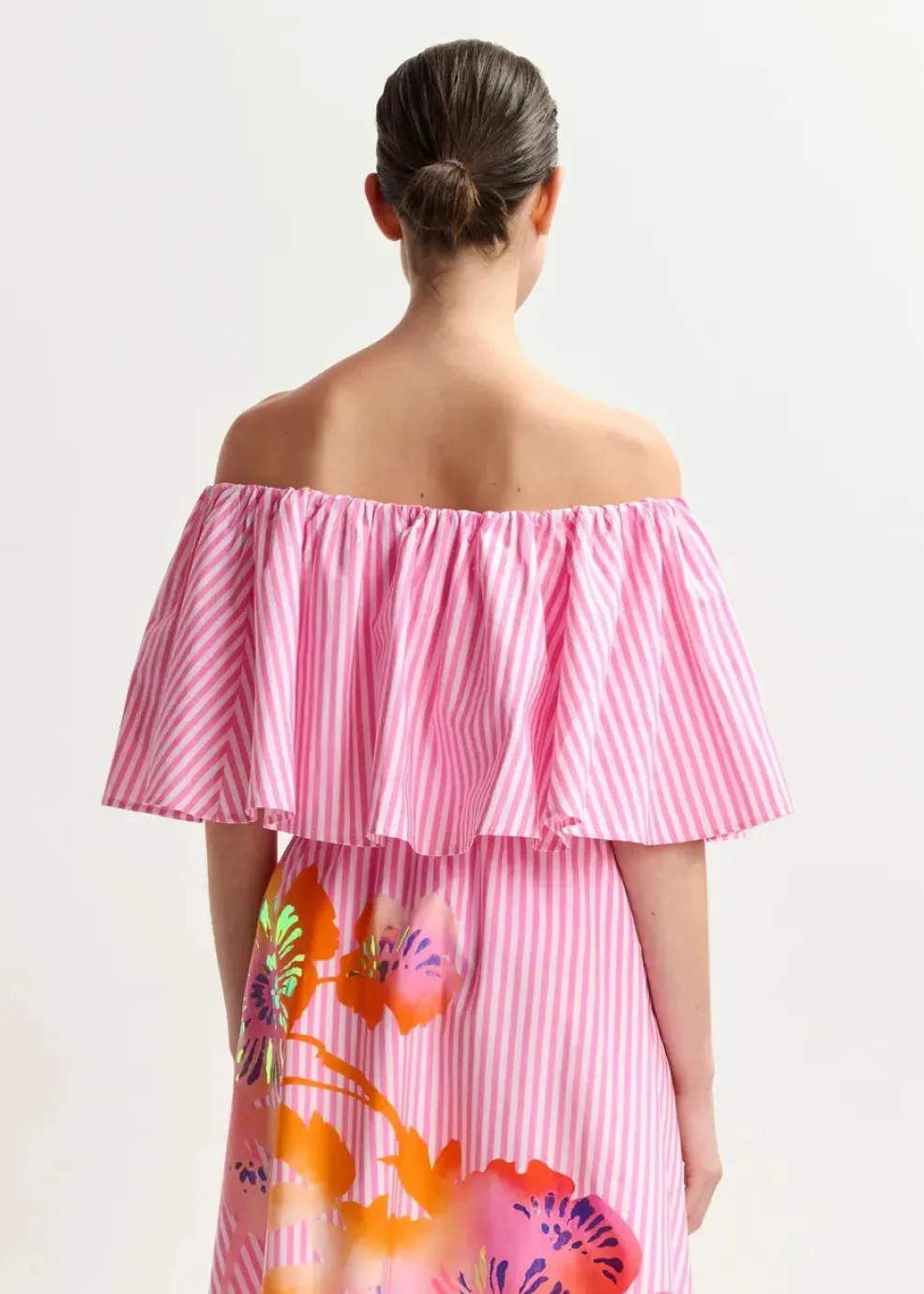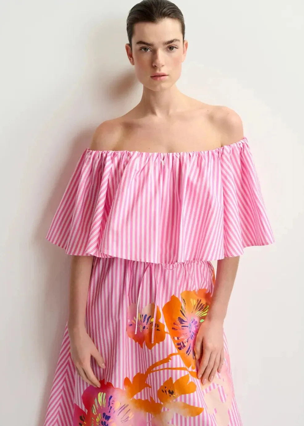 Off-shoulder top fra Essentiel Antwerp med pink og hvide striber. Toppen har flæser øverst og en løs pasform med elastik forneden.