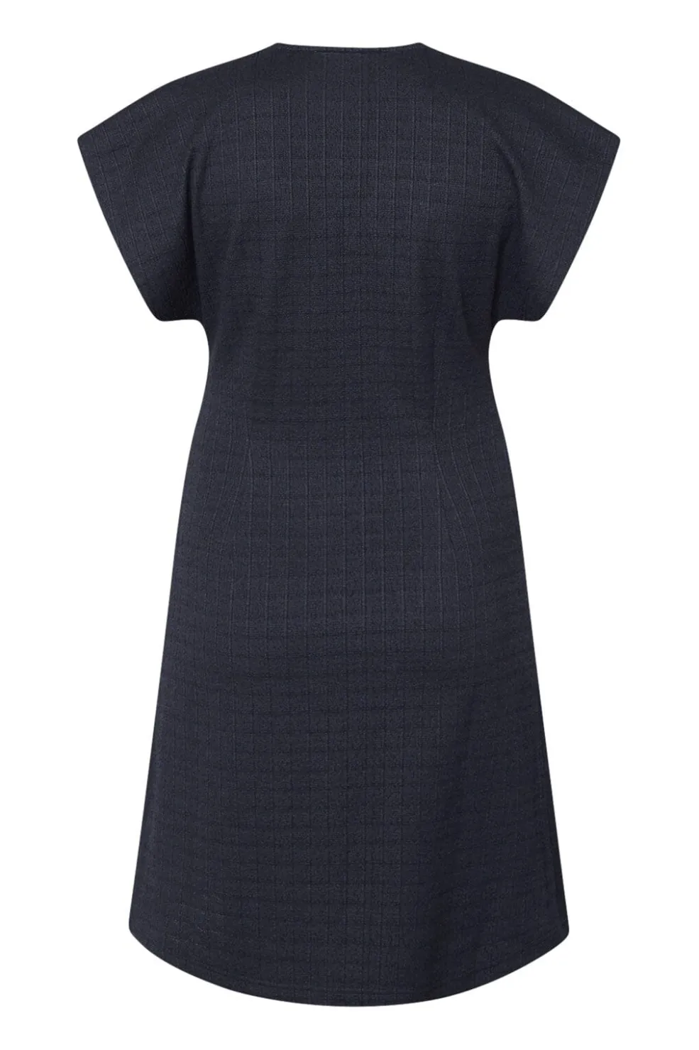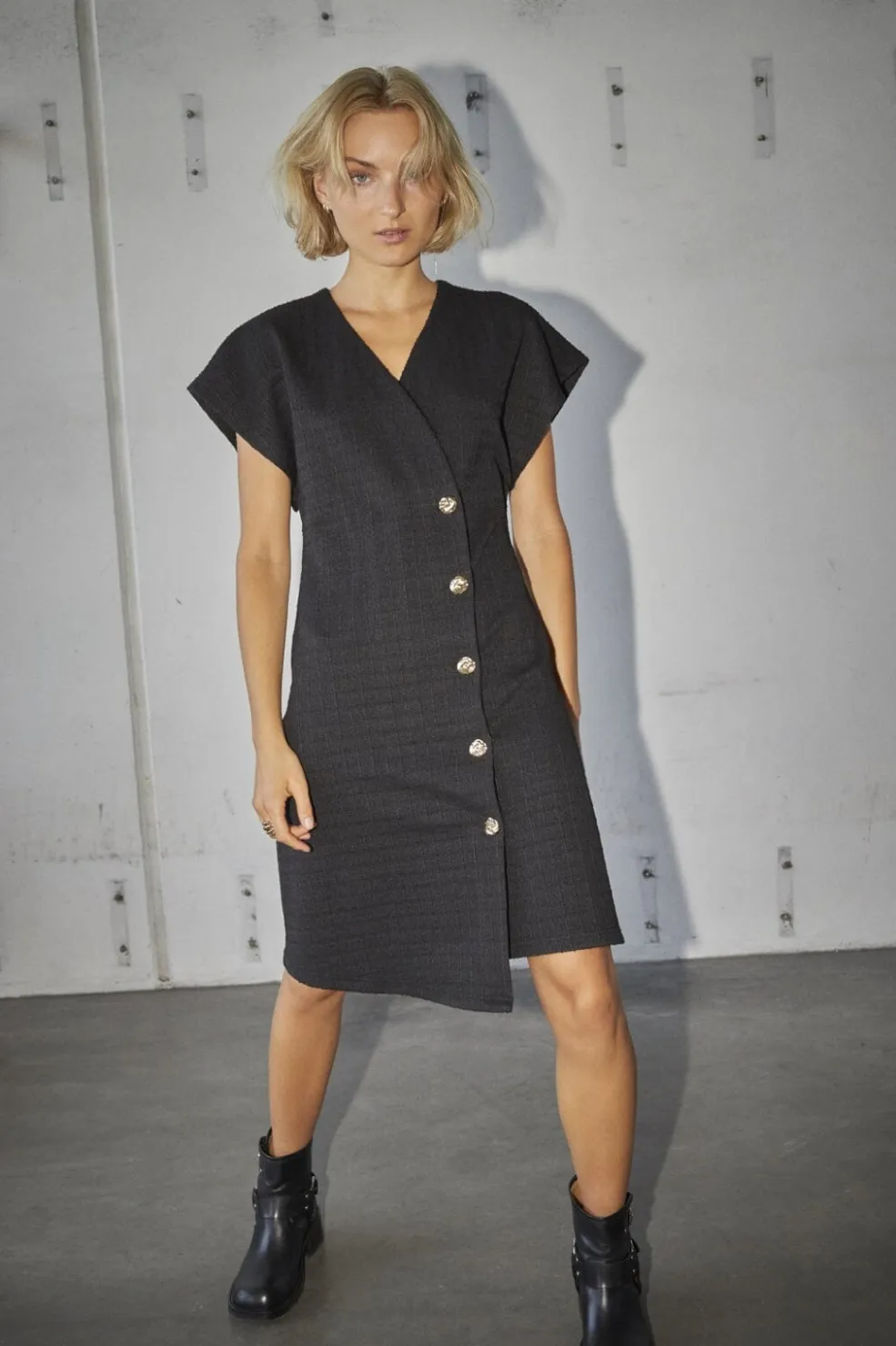 Sort kjole fra Sisters Point med V-hals og korte flagermusærmer. Kjolen har en struktureret overflade og guldfarvede knapper langs fronten.