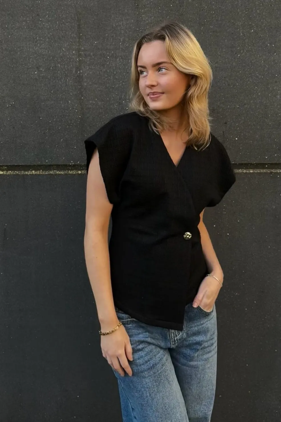 Sort vest fra Sisters Point med asymmetrisk slå-om-design. Den har korte kimonoærmer og en V-halsudskæring, der giver vesten et let udtryk. En guldknap ved taljen samler designet.