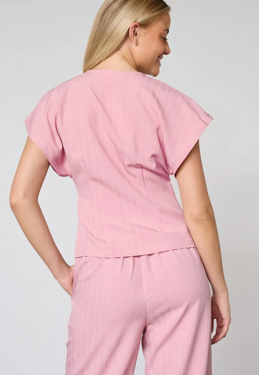 Lyserød vest fra Sisters Point med pinstripe-mønster. Vesten er lavet af 90 % polyester, 7 % viskose og 3 % elastan, og den passer til både formelle anledninger, hverdagen og fest.