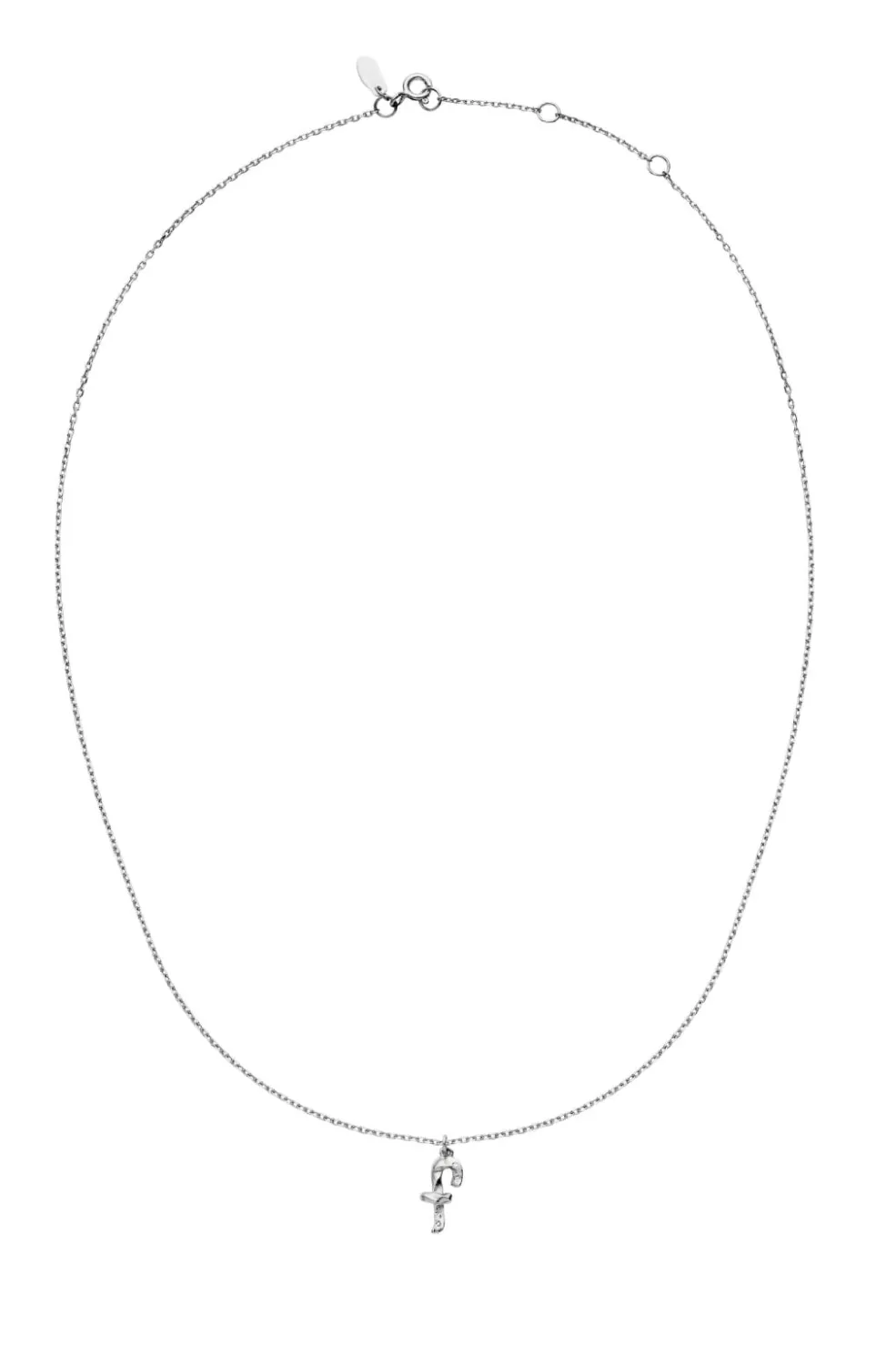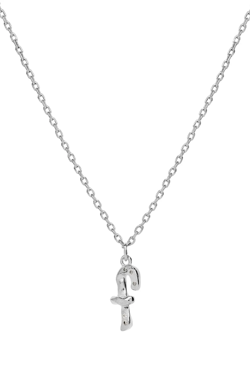 Sølvhalskæde fra Maanesten med et F-formet vedhæng. Halskæden er lavet af genanvendt sterlingsølv med en blank overflade og har en justerbar kæde.