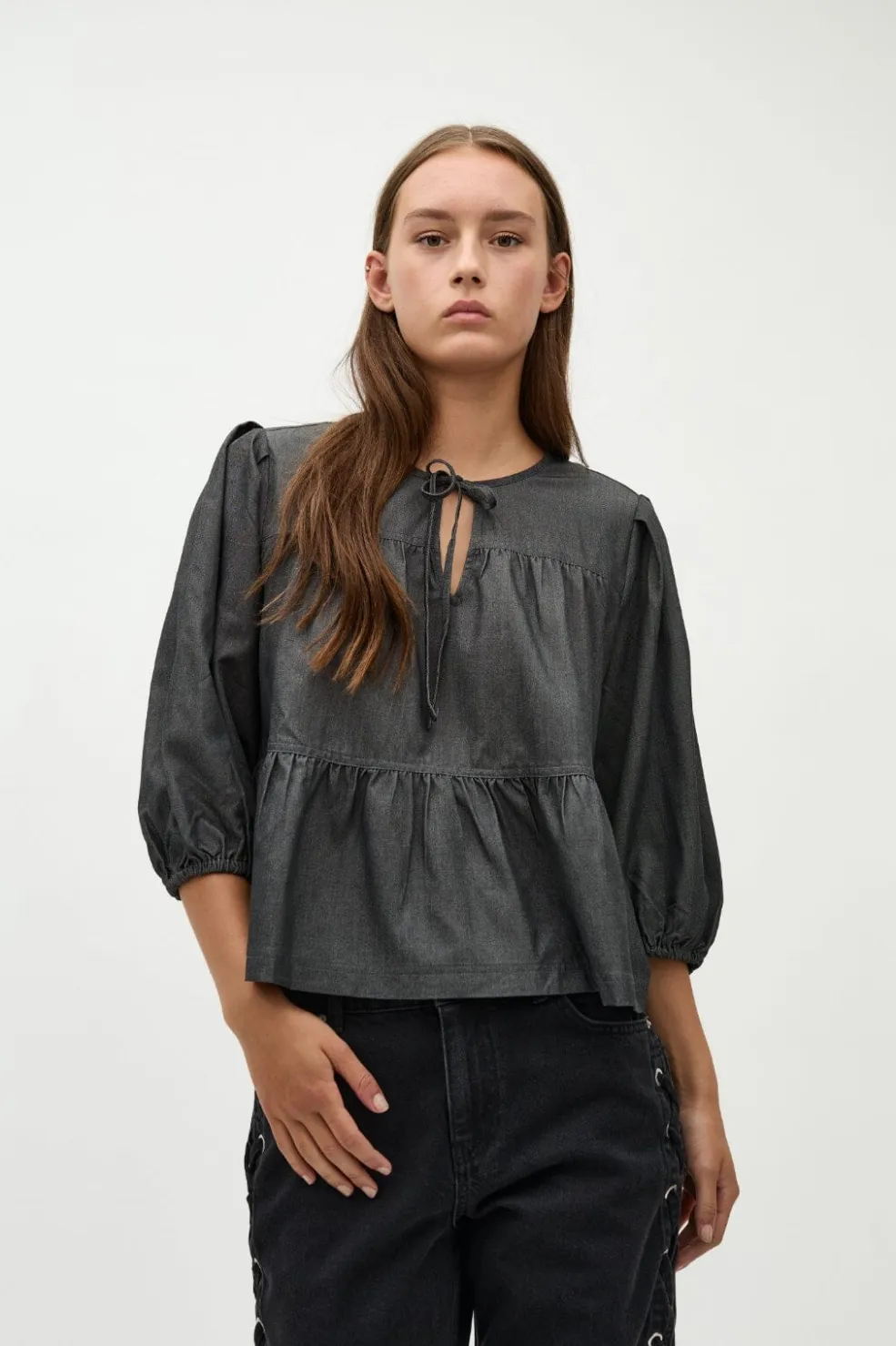 Sort bluse fra Global Funk med lagdelt design og flæser. V-hals med snøredetaljer og 3/4 pufærmer med elastiske manchetter giver blusen et feminint præg.