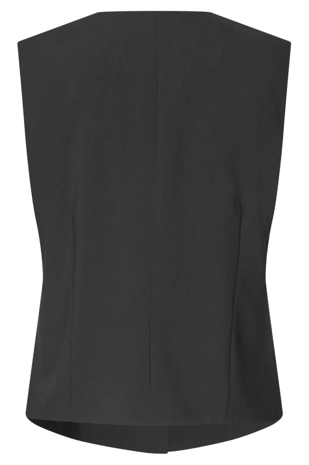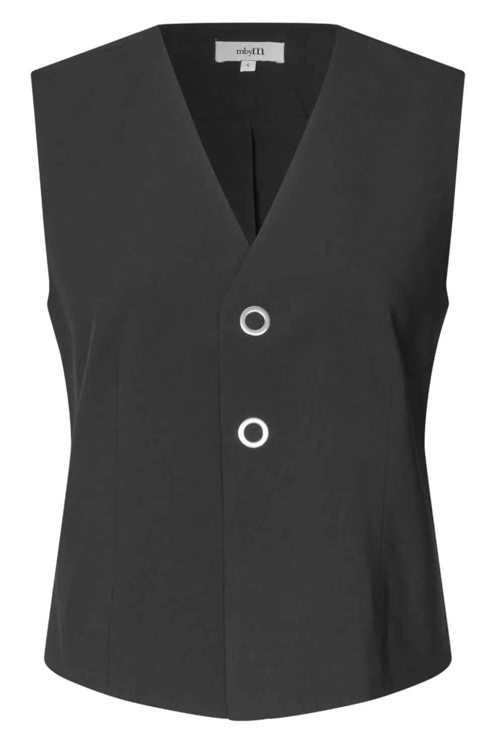 Sort ærmeløs top fra MbyM med V-hals og to sølvfarvede knapper. Toppen har en normal pasform og er lavet af et behageligt materiale med stretch.