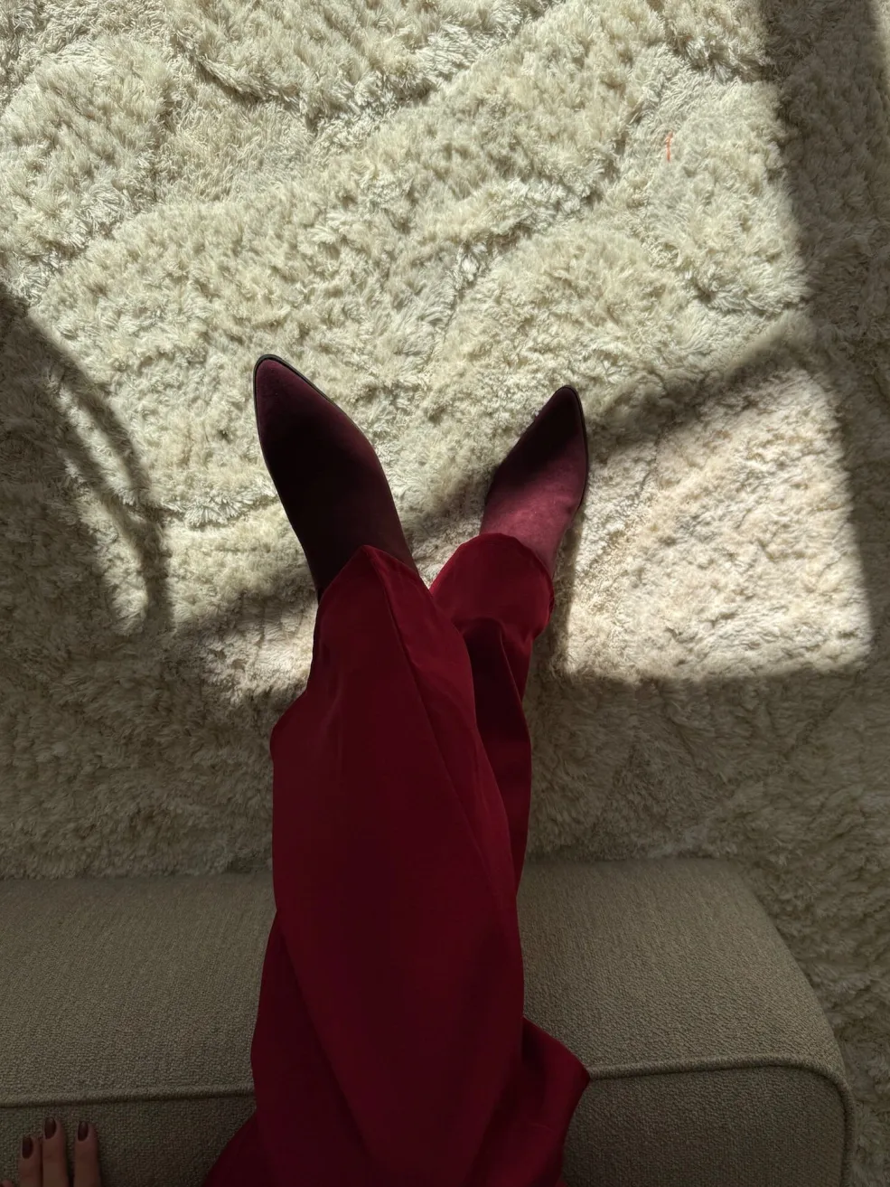 Burgundy-farvede støvler fra Bloom med spids tå og tynd hæl. Støvlerne har en mørk rød nuance.