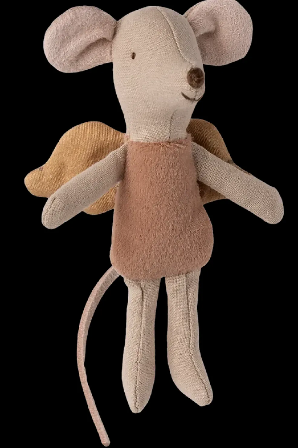 En fe-mus fra Maileg med bløde vinger i beige og brune nuancer. Musen har en lang hale og en brun overdel med beige arme og ben.